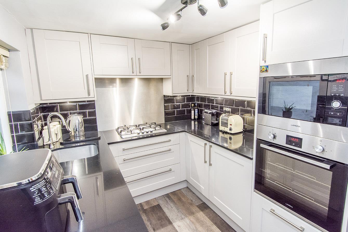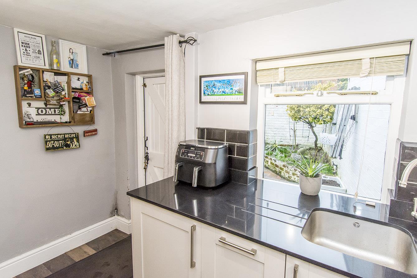 Kitchen - 3.35m x 2.26m (11'0 x 7'5) - Fitted with a range of modern cabinets with quartz surfaces. Stainless steel undermounted sink with mixer taps. Built in oven and combination microwave. Gas hob with extractor canopy. Integral dishwasher, washing machine and fridge. There is a window to the rear aspect, laminate flooring and a wooden door that gives direct access to the courtyard garden.