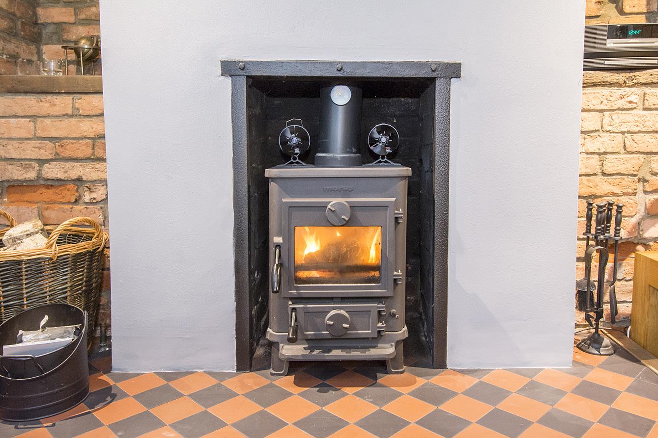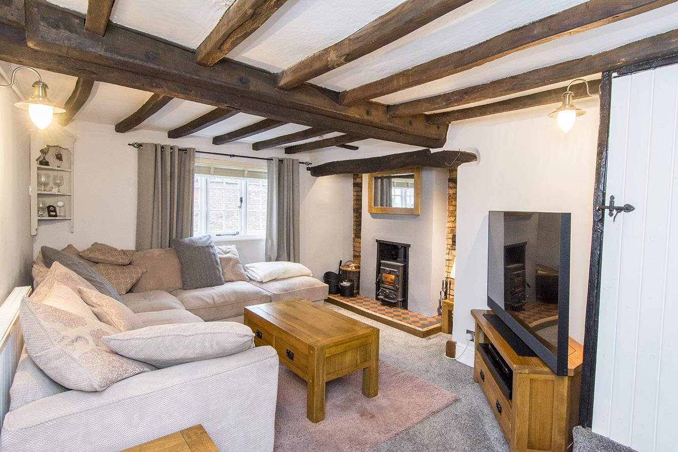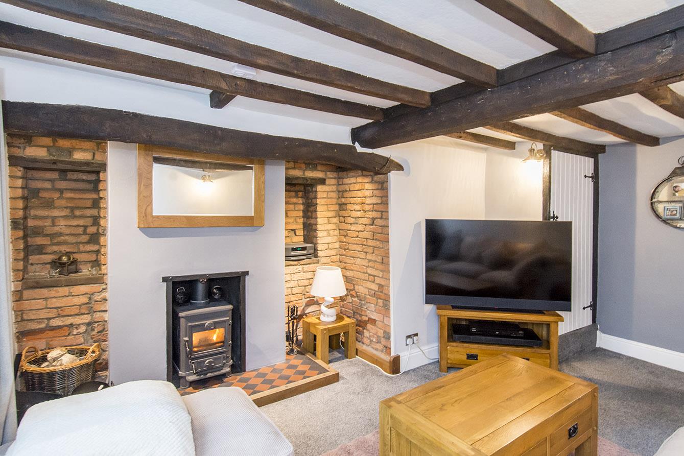Lounge - 4.88m x 3.84m (16'0 x 12'7) - This cosy lounge has dual aspect windows and exposed timber beams to the ceiling. The brick inglenook fireplace has a timber beam mantle and a quarry tiled hearth that houses a Morso Squirrel woodburning stove. A door leads to the staircase rising to the first floor accomodation.