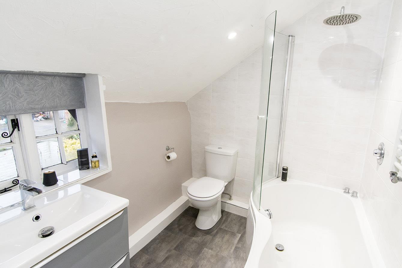 Bathroom - 2.21m x 1.88m (7'3" x 6'2") - Fitted with a low level WC. Hand wash basin set onto a bespoke set of drawers. Bath with shower and side screen. Heated towel rail. Ceramic wall tiles and vinyl flooring. Opaque window to the rear aspect.