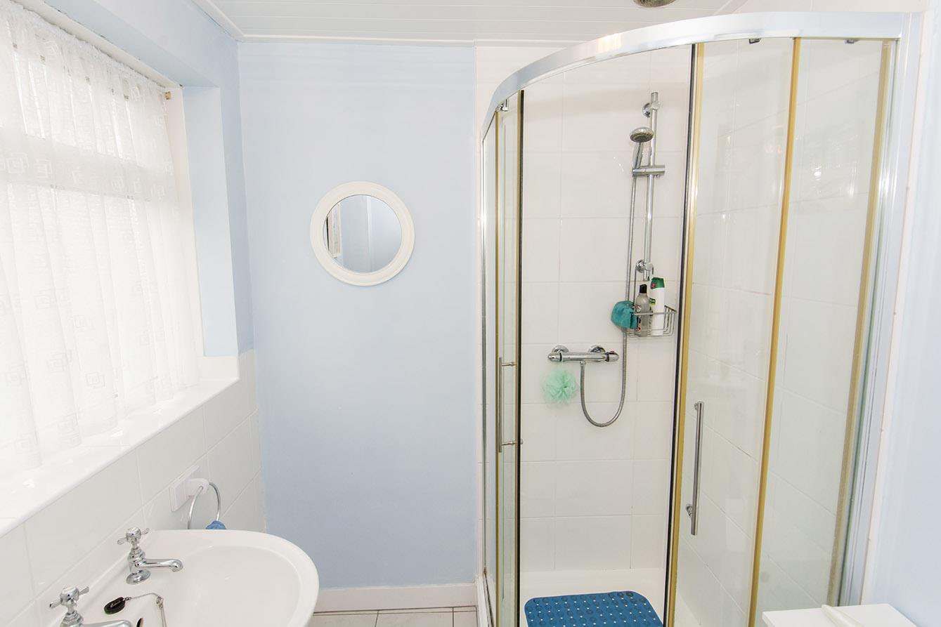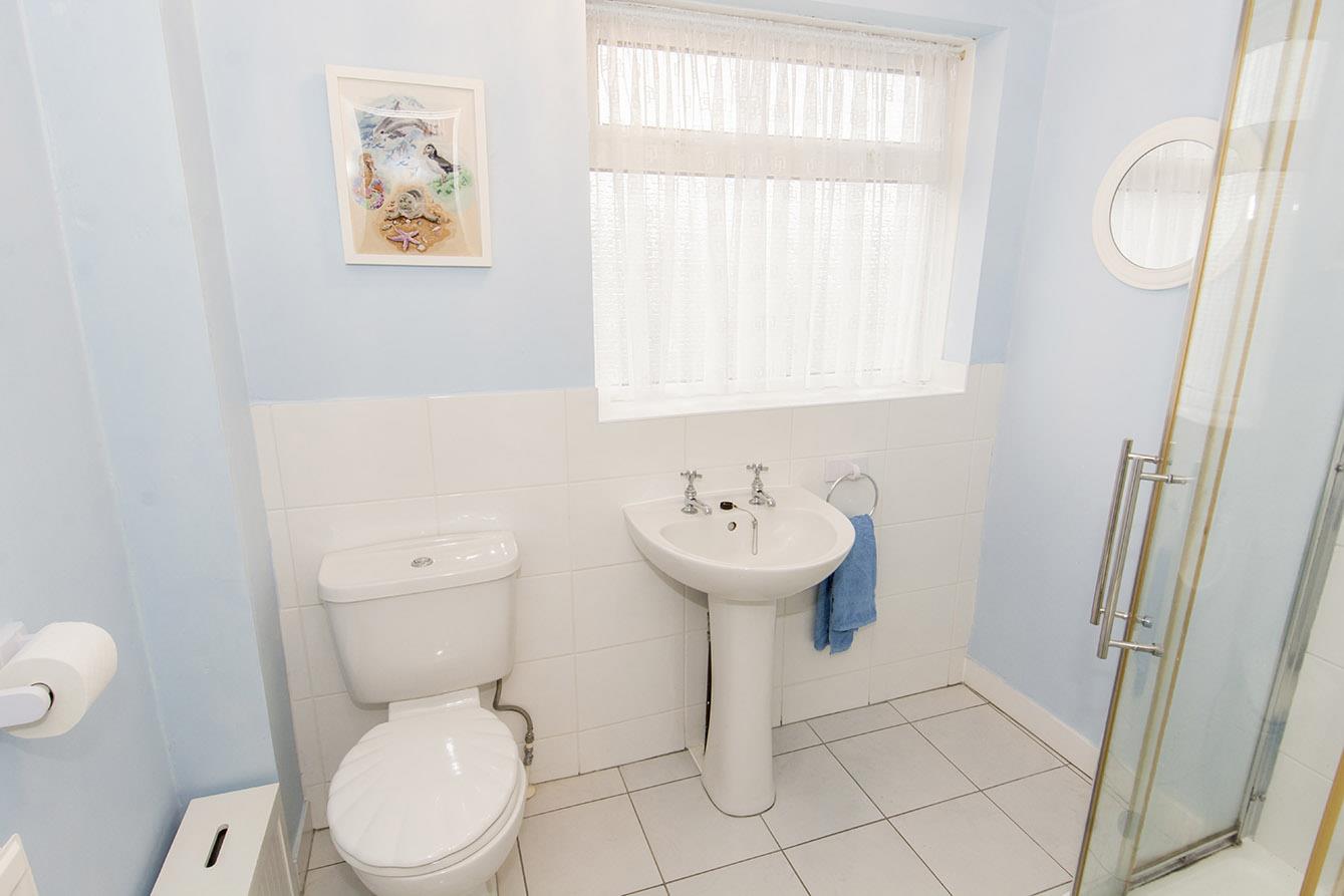 Shower Room - 2.29m x 1.65m (7'6" x 5'5") - Opaque UPVC double-glazed windows to side and rear aspects. Three piece white suite comprising: WC, wash hand basin and shower cubicle. Tiled splash backs. Tiled floor. Radiator.