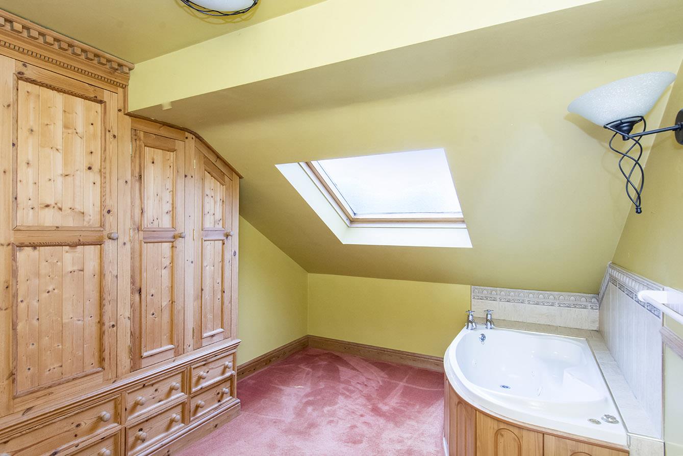 Family Bathroom - 3.94m x 2.79m (12'11" x 9'2") - Fitted white suite comprising spa bath, pedestal wash hand basin, bidet and low level WC. Fitted linen cupboards with radiator inside and pine doors. Wall light. Radiator. Opaque double glazed velux window. Extractor.