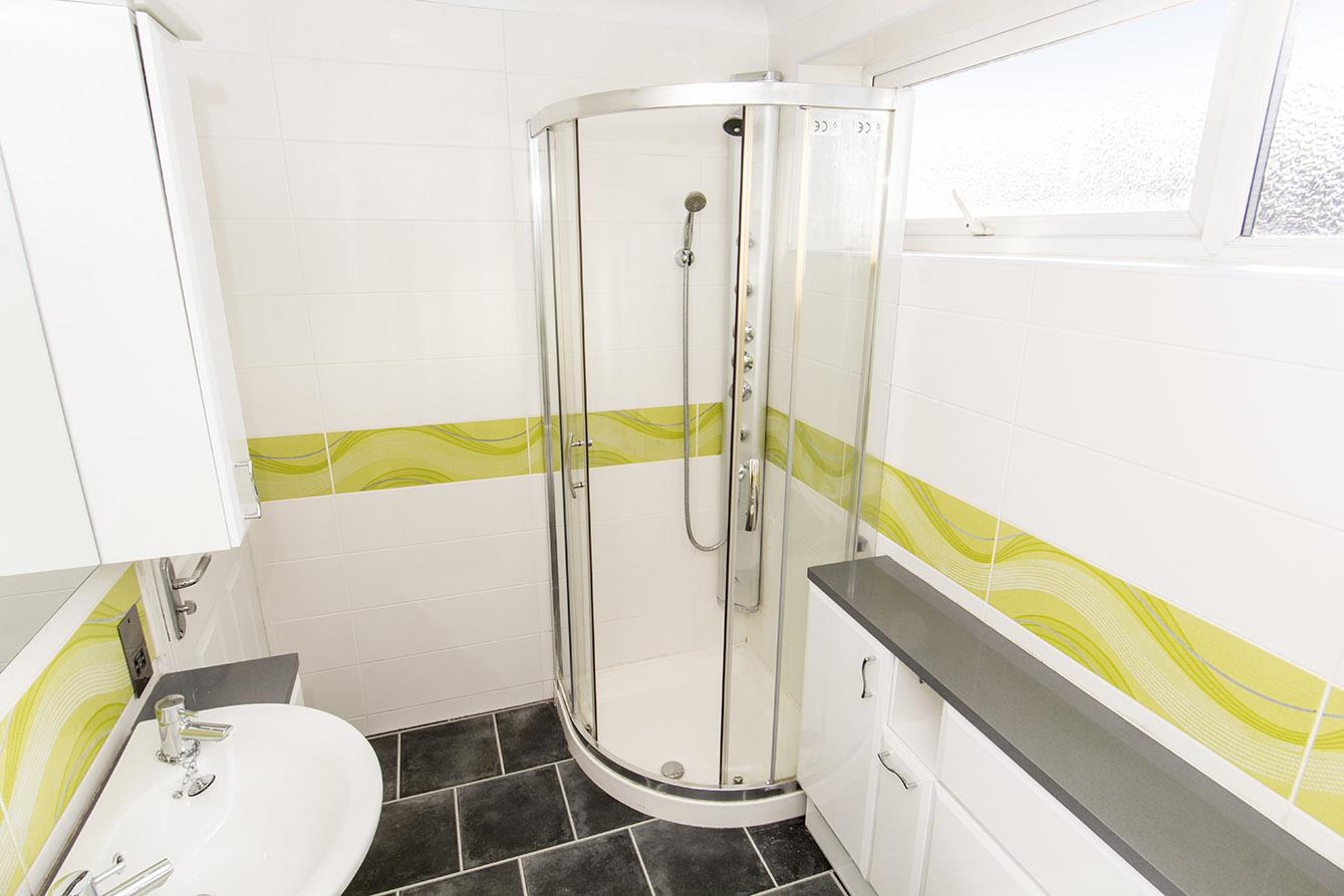 Bathroom - 2.77m x 1.63m (9'1" x 5'4") - Opaque UPVC double-glazed window to front. White four piece suite comprising WC, wash hand basin inset to storage units, panelled bath with shower mixer tap over and separate shower cubicle. Tiled walls and flooring. Heated towel rail. Shaver point. Vanity mirror and lighting.