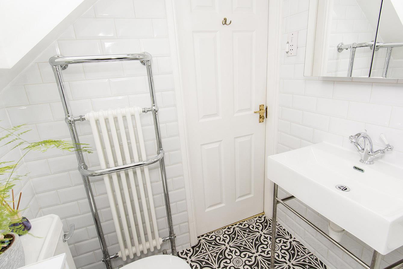 En-Suite - 2.06 x 1.65 - Re-fitted shower room comprising: Double walk in shower, hand basin and low level WC. Feature wall and floor tiling. Heated towel rail. Velux window to rear aspect.