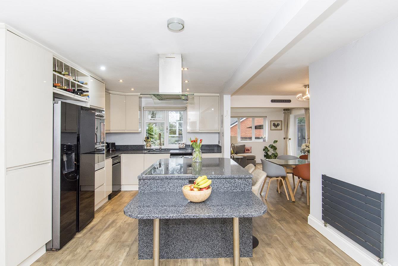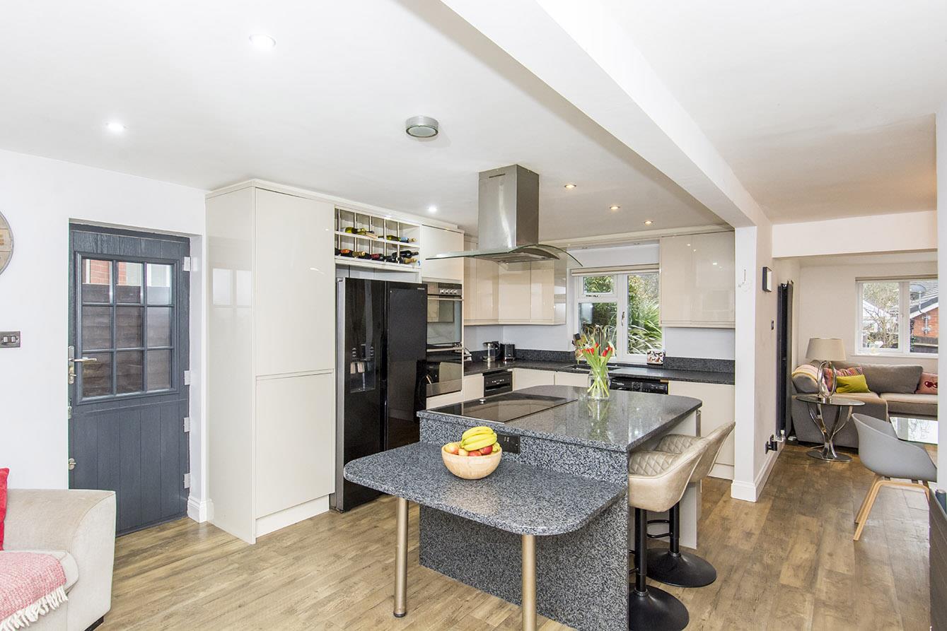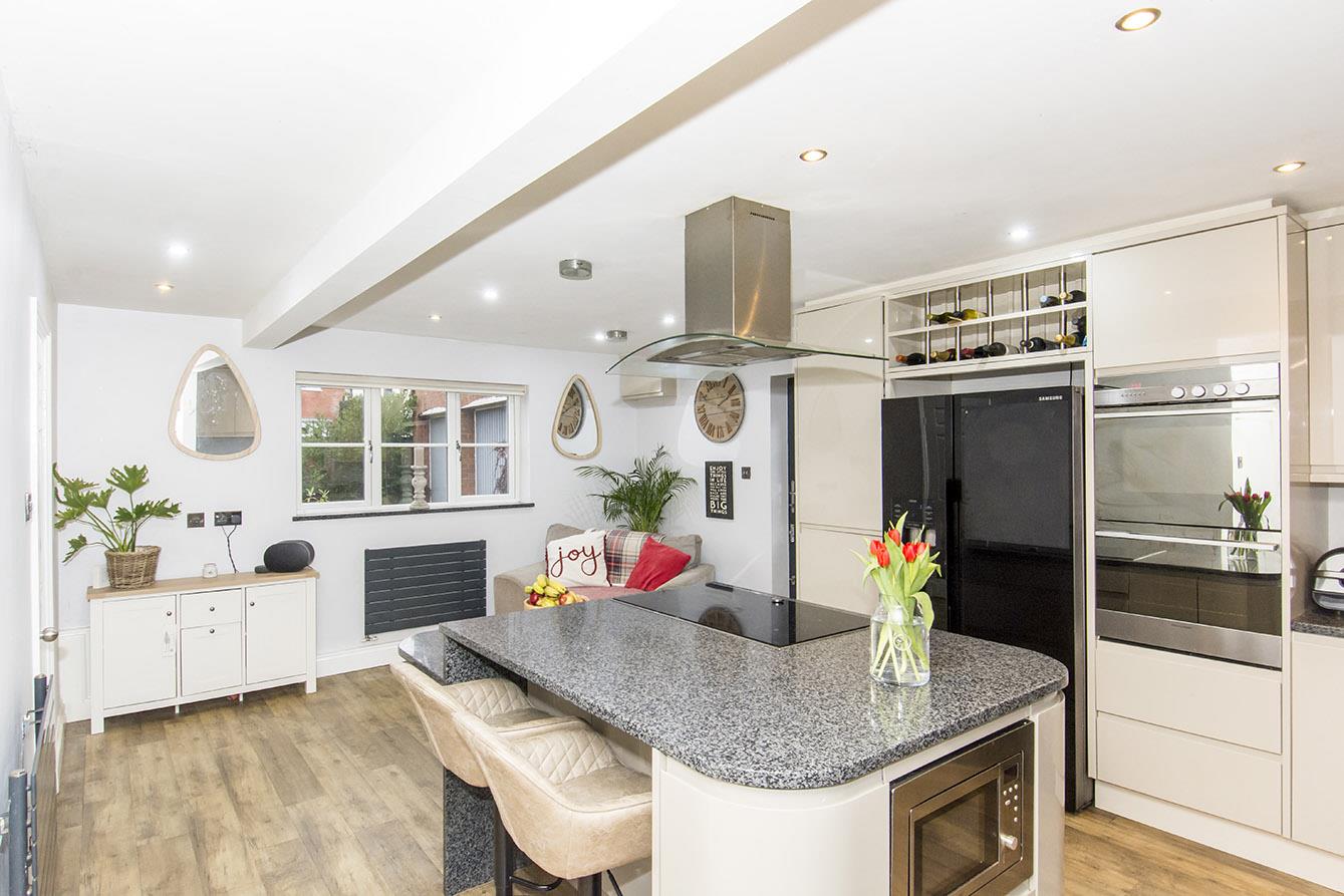Kitchen - 6.43m x 4.04m (21'1" x 13'3") - UPVC double-glazed windows to front and rear. Double-glazed composite stable style side entrance door. Fitted range of gloss faced wall and floor mounted units and central island with granite work tops. Electric double oven. Electric hob with extractor hood over. Space and plumbing for washing machine and dishwasher. Space for American style fridge/freezer. Two designer radiators. Open through to living/dining room.