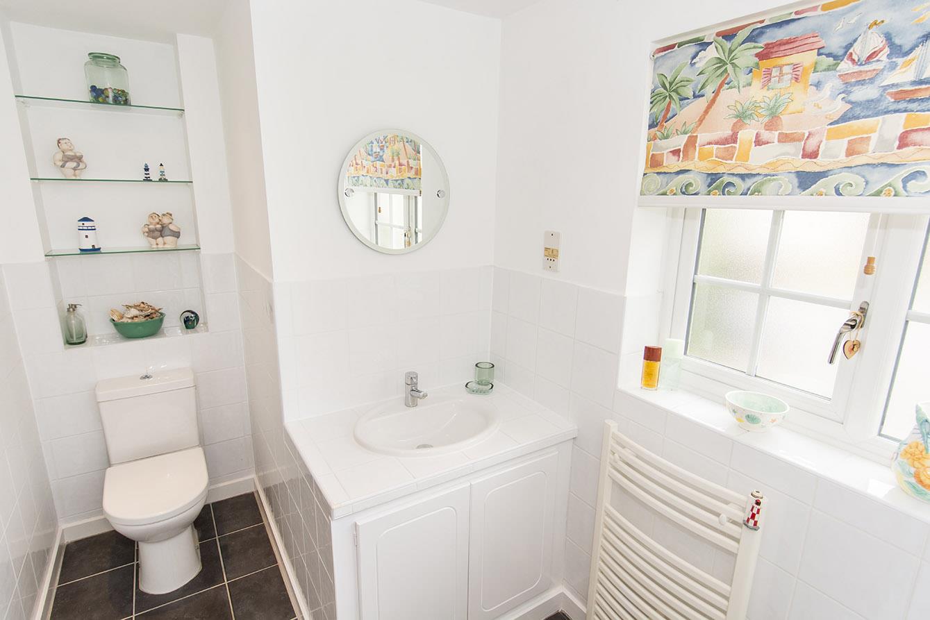 Ground Floor W/C - Opaque UPVC double-glazed window to front. W/C. Wash hand basin over storage unit. Tiled flooring.