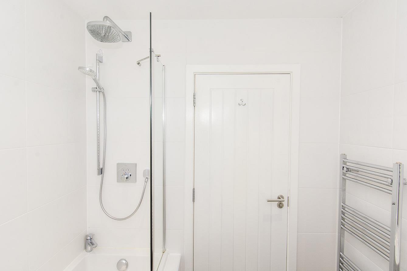 Bathroom - 2.01m x 1.98m (6'7" x 6'6") - UPVC double-glazed window to rear. WC. Wash hand basin over drawer unit. Panelled bath with built in shower and glazed shower screen. Tiled walls. Tiled floor. Extractor fan. Heated towel rail.