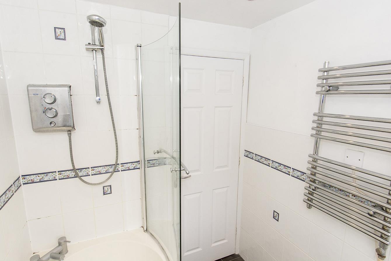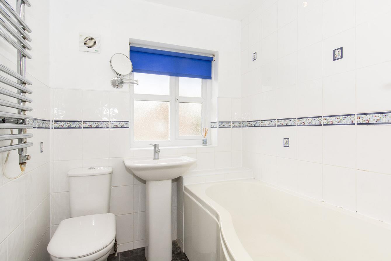 Bathroom - Panelled bath with electric shower fitment over. Pedestal wash hand basin. Low level WC. Complementary tiled walls and floor. Heated towel rail. Extractor fan. Opaque double glazed window.