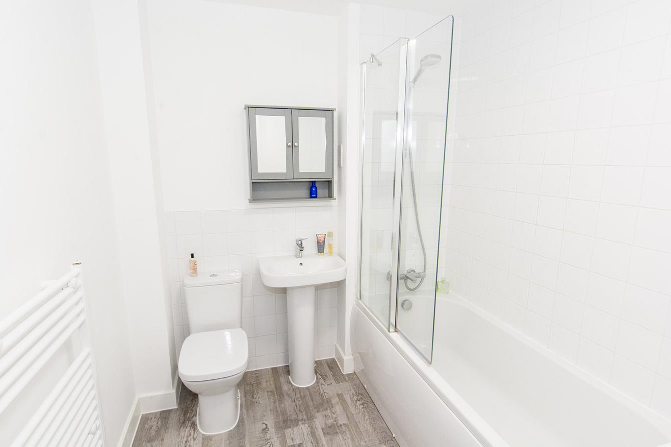 Bathroom - 2.46m x 2.06m (8'1" x 6'9") - Fitted with a low-level WC and a pedestal hand wash basin. There is a bath with a shower over and a side screen. Ceramic wall tiling and luxury vinyl flooring. Heated towel rail.