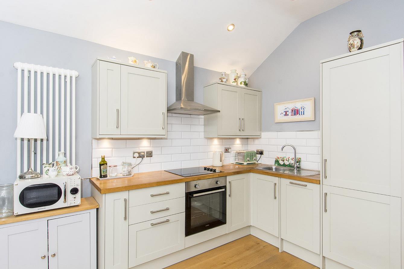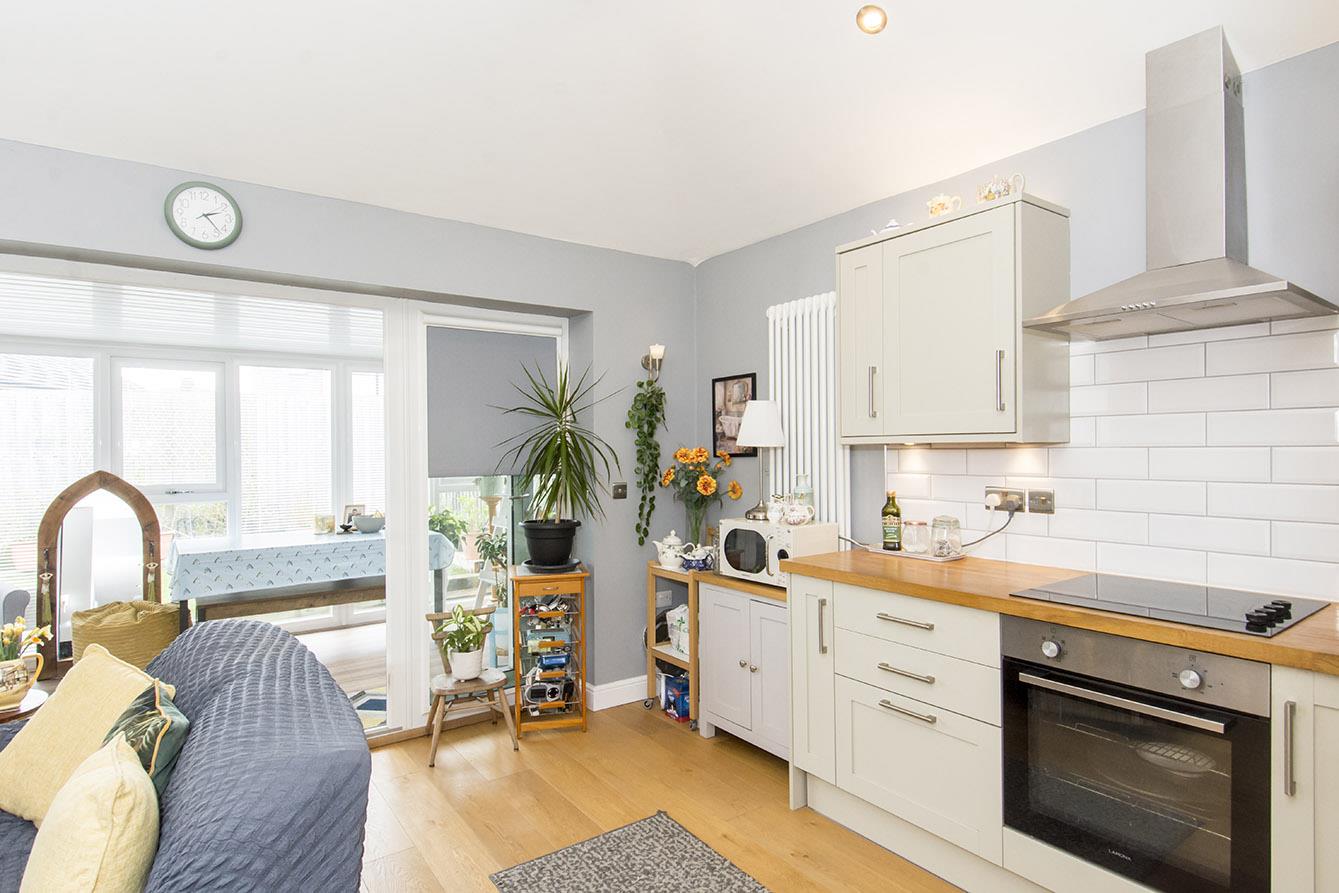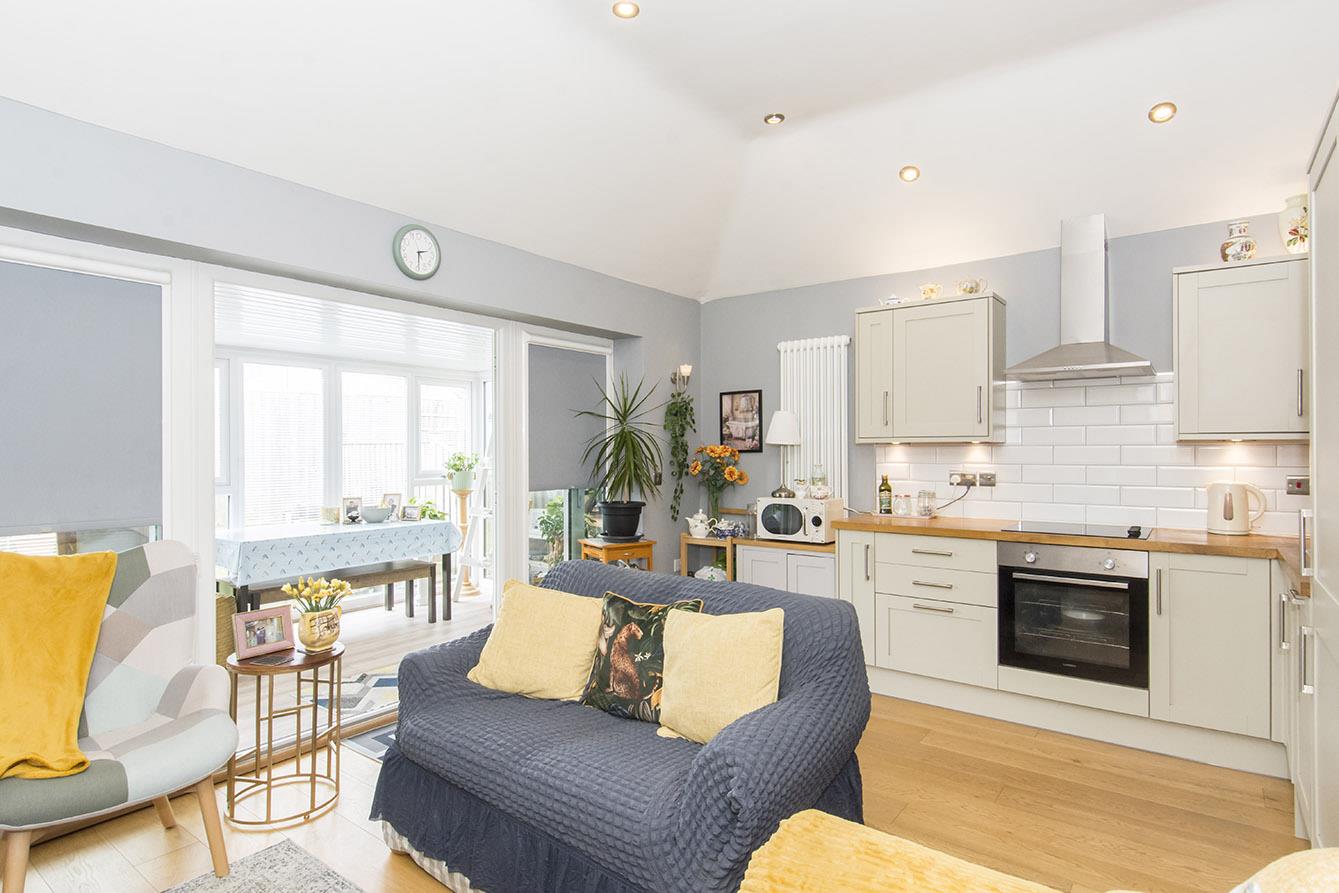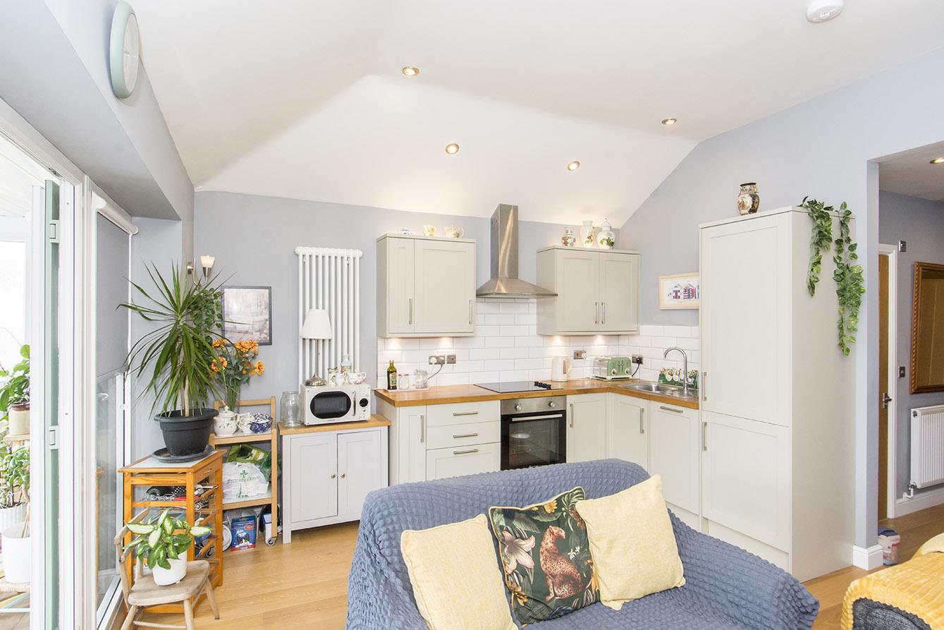 Open Plan Living, Dining, Kitchen - 4.75m x 3.76m (15'7" x 12'4") - The heart of the home is the open-plan living kitchen, which boasts modern cabinets and integrated appliances, making it a joy for any cooking enthusiast. The adjoining lounge area is a serene space, ideal for relaxation, The kitchen is fitted with a range of wall and base units with wood block work surfaces over, stainless steel with mixer taps, electric oven, electric hob with extractor fan over, integrated fridge-freezer and dishwasher. Solid oak flooring throughout and a vertical radiator as well as a radiator in a decorative cabinet.