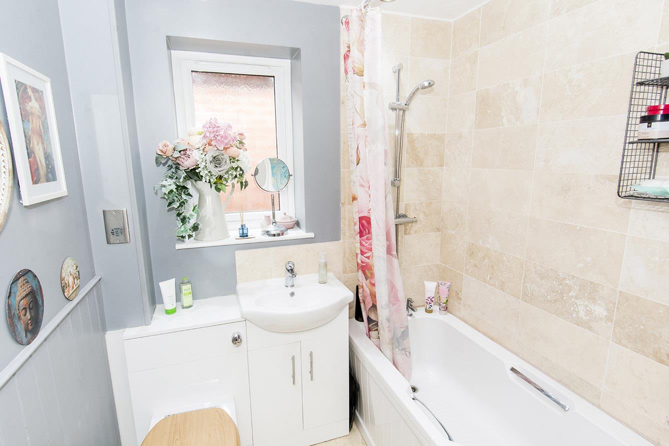 Bathroom - 1.70m x 1.85m (5'7" x 6'1") - Fitted with aback to wall W/C, wash hand basin set into a vanity unit, bath with shower over and a chrome heated towel rail. Ceramic wall and floor tiles throughout. An opaque window to the side aspect