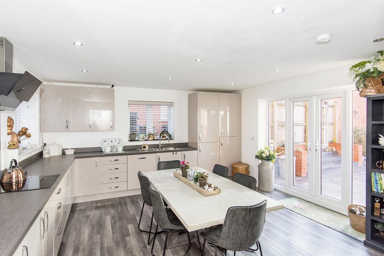 Dining Kitchen - 4.80m x 4.42m (15'9" x 14'6") - Fitted with modern gloss cabinets and complimenting work surfaces over. The kitchen has a stainless steel bowl and a half sink with mixer taps and an integrated dishwasher. There are a set of French doors opening into the garden and two windows to the side aspect - allowing an abundance of natural light to flow through this space. There is ample room for a full sized dining table. There is a double oven with an induction hob. Karndean flooring throughout.