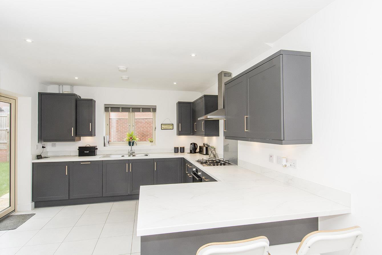 Living Dining Kitchen - 9.07m x 2.87m (29'9 x 9'5) - The kitchen is fitted with slate grey cabinets with complimenting work surfaces, stainless steel bowl and a half sink with mixer taps, oven, gas hob and and extractor fan with a glass splash back. There is also an integrated dishwasher. There is a breakfast bar seating area within the kitchen area. A delightful box bay window to the side aspect fits a sofa. The dining area is the perfect space to entertain friends and family. There are dual aspect windows to both the front and rear aspect.