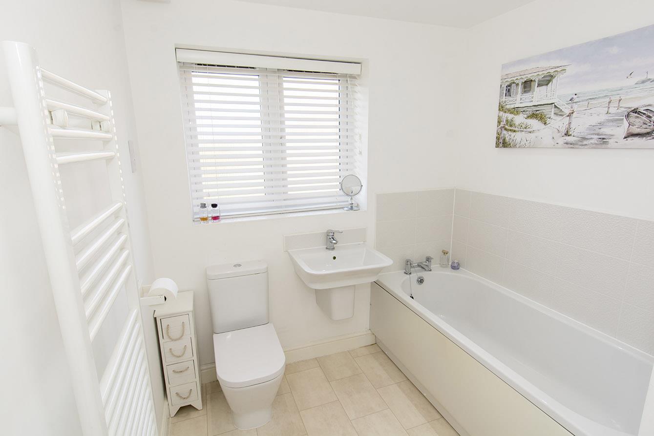 Bathroom - 2.54m x 2.13m (8'4" x 7') - Fitted with a low-level W/C, a wall hung wash hand basin, a bath and a heated towel rail. Vinyl tiled flooring.
