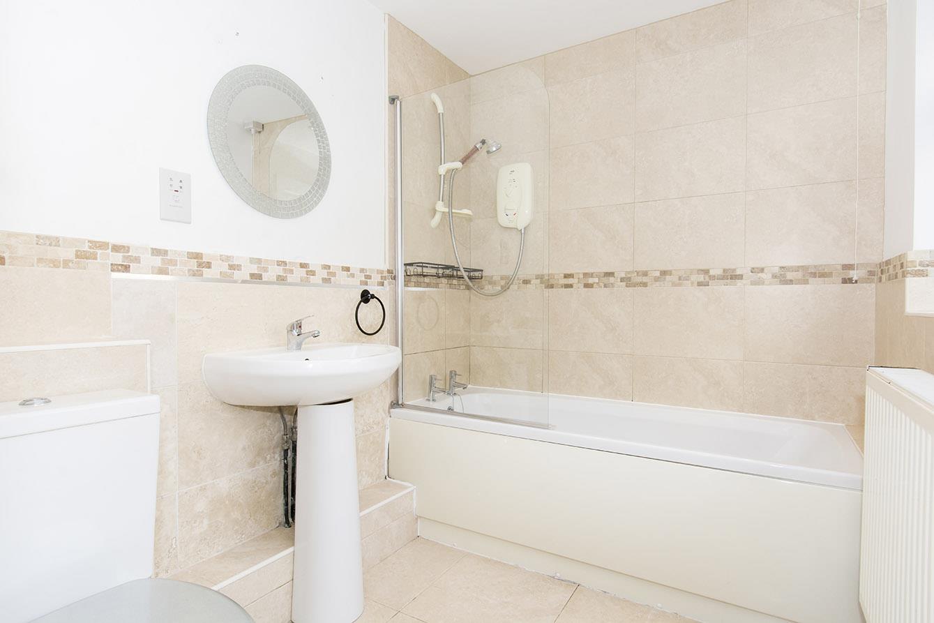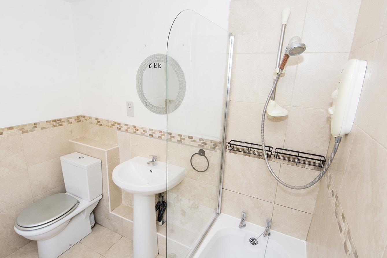 Bathroom - 2.29m x 1.75m (7'6" x 5'9") - Opaque UPVC double-glazed window. WC. Wash hand basin, Panelled bath with glazed shower screen and electric shower over. Shaver point. Tiling to walls and floor. Radiator.