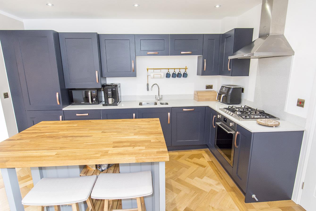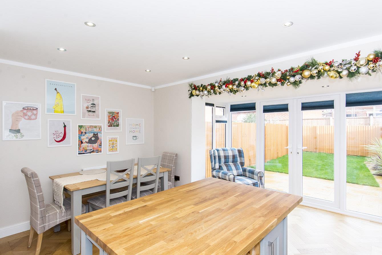 Kitchen / Diner - 5.31m max x 4.62m (17'5" max x 15'2") - UPVC double-glazed French doors and windows with fitted blinds arranged in a box-bay formation to the rear aspect. Fitted with a range of floor and wall mounted units with upgraded quartz stone worktops over and stainless steel one and a half bowl sink inset. Freestanding central island with oak worktops included. Electric oven. Gas hob with extractor hood over. Integrated dishwasher. Integrated fridge and freezer. Space and plumbing for washing machine. Solid oak parquet flooring. Two radiators.