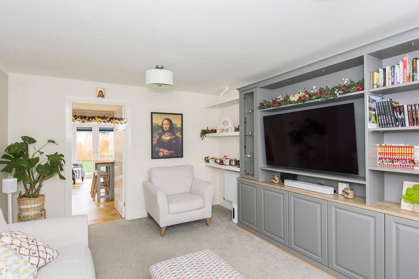 Lounge - 5.21m into bay x 3.53m (17'1 into bay x 11'7) - UPVC double-glazed bay window with plantation shutters to front. Feature fitted media wall. Understairs storage cupboard. Two radiators.