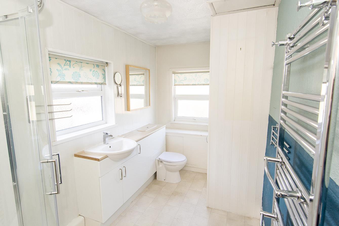 Shower Room - 3.78m x 1.91m (12'5" x 6'3") - Opaque UPVC double-glazed windows to rear and side aspects. White three piece suite comprising WC and wash hand basin inset to storage units and shower cubicle. Airing cupboard housing combination gas central heating boiler and shelving. Heated towel rail.
