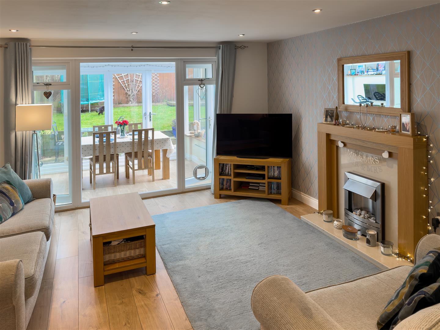 Lounge/Diner - 5.00m x 4.06m (16'5" x 13'4") - Electric fire inset to polished stone fireplace with timber mantlepiece over. Spotlights to ceiling. Radiator. UPVC double-glazed French doors with side lights to conservatory.