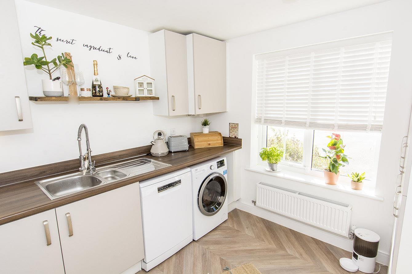 Kitchen - 3.43m x 2.54m (11'3" x 8'4") - UPVC double-glazed window to front. Fitted range of wall and floor mounted kitchen units with lighting under and worktops over. Stainless steel one and a half bowl sink with rinser tap and drainer. Electric oven. Gas hob with extractor hood over. Space and plumbing for washing machine and dishwasher. Space for fridge/freezer. Extractor fan to ceiling. Smoke alarm to ceiling. Radiator. Vinyl flooring.