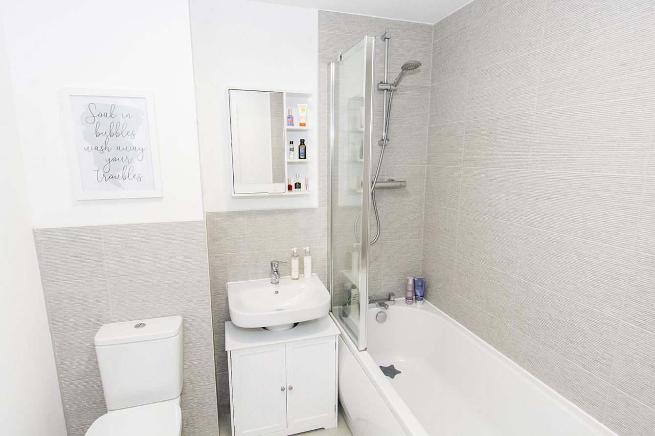 Bathroom - 2.03m x 1.96m (6'8" x 6'5") - Three piece white suite comprising WC, wash hand basin and panelled bath with built in shower and glazed shower screen. Vanity unit. Shaver point. Tiled splash backs. Extractor fan.