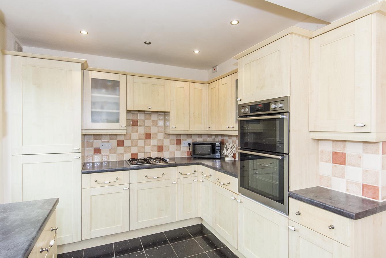 Kitchen - 3.96m x 2.69m (13'0" x 8'10") - Fitted with a range of wall and floor mounted kitchen units with roll edge worktops and complimentary tiling. Double-glazed window to rear. Opaque double-glazed side entrance door. Fitted double oven. Gas hob. Intergrated fridge/freezer. Space and plumbing for washing machine. Stainless steel sink with mixer tap and drainer.