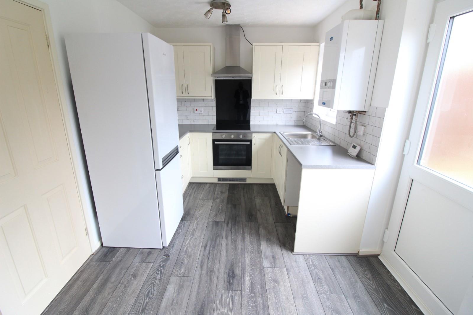 Kitchen - 4.04 x 2.46 (13'3" x 8'0") - Modern range of fitted base and wall units. Roll edge work surface with complementary tiled splash backs. Fitted oven and four ring electric hob beneath stainless steel extractor hood. Stainless steel sink and drainer. Space and plumbing for automatic washing machine. Wall mounted gas fired central heating boiler. Radiator. Wood laminate flooring. Two double glazed window to the rear elevation. Opaque double glazed door opening out to the rear garden.