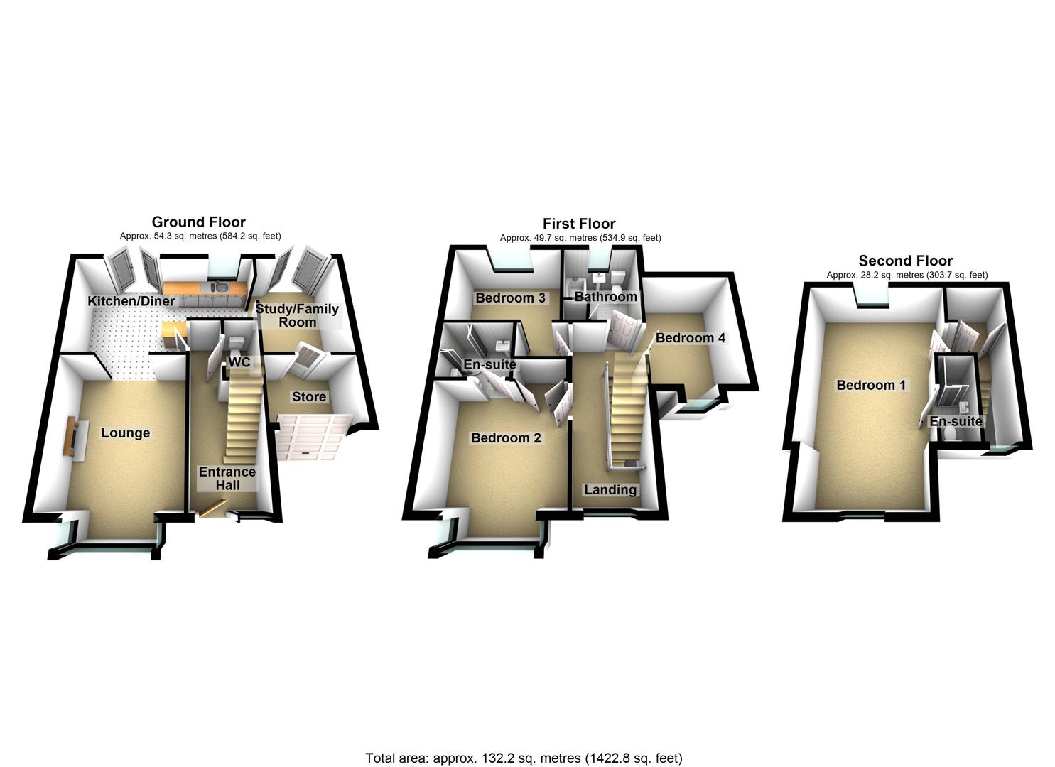 On the ground floor there is an entrance hallway, with ground floor WC, kitchen/diner opening through to study/family room, box bay fronted lounge and store room (formally the front half of the garage). To the first floor there is a landing, three bedrooms, en-suite and family bathroom. To the second floor is a further bedroom and additional en-suite. Outside there is a block paved driveway to the front and a low maintenance enclosed garden to the rear.