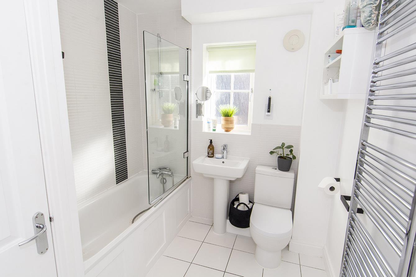 Family Bathroom - 2.49m x 2.16m (8'2" x 7'1") - Opaque double-glazed window to rear. WC. Wash hand basin. Panelled bath with shower mixer tap and glazed shower screen. Extractor fan. Spotlights to ceiling. Airing cupboard. Heated towel rail.