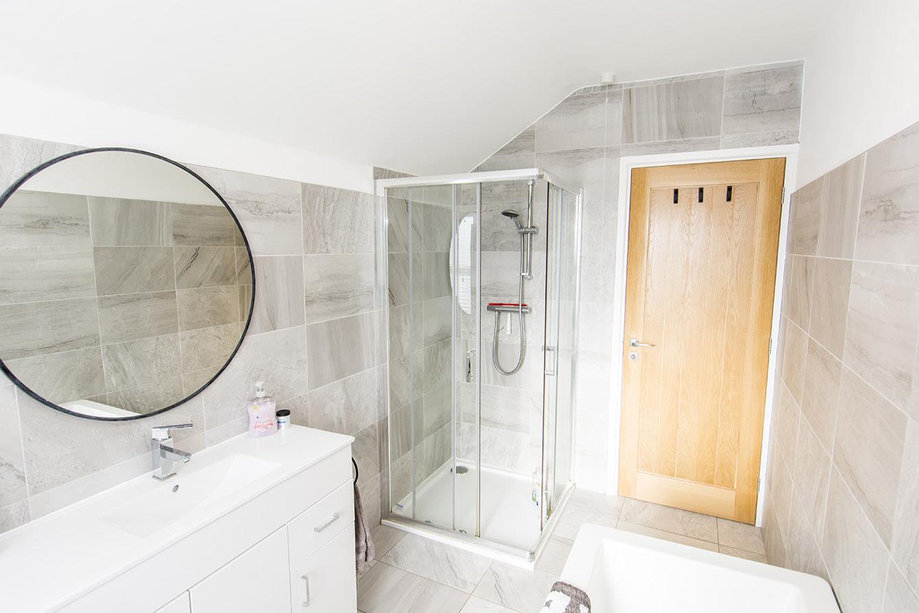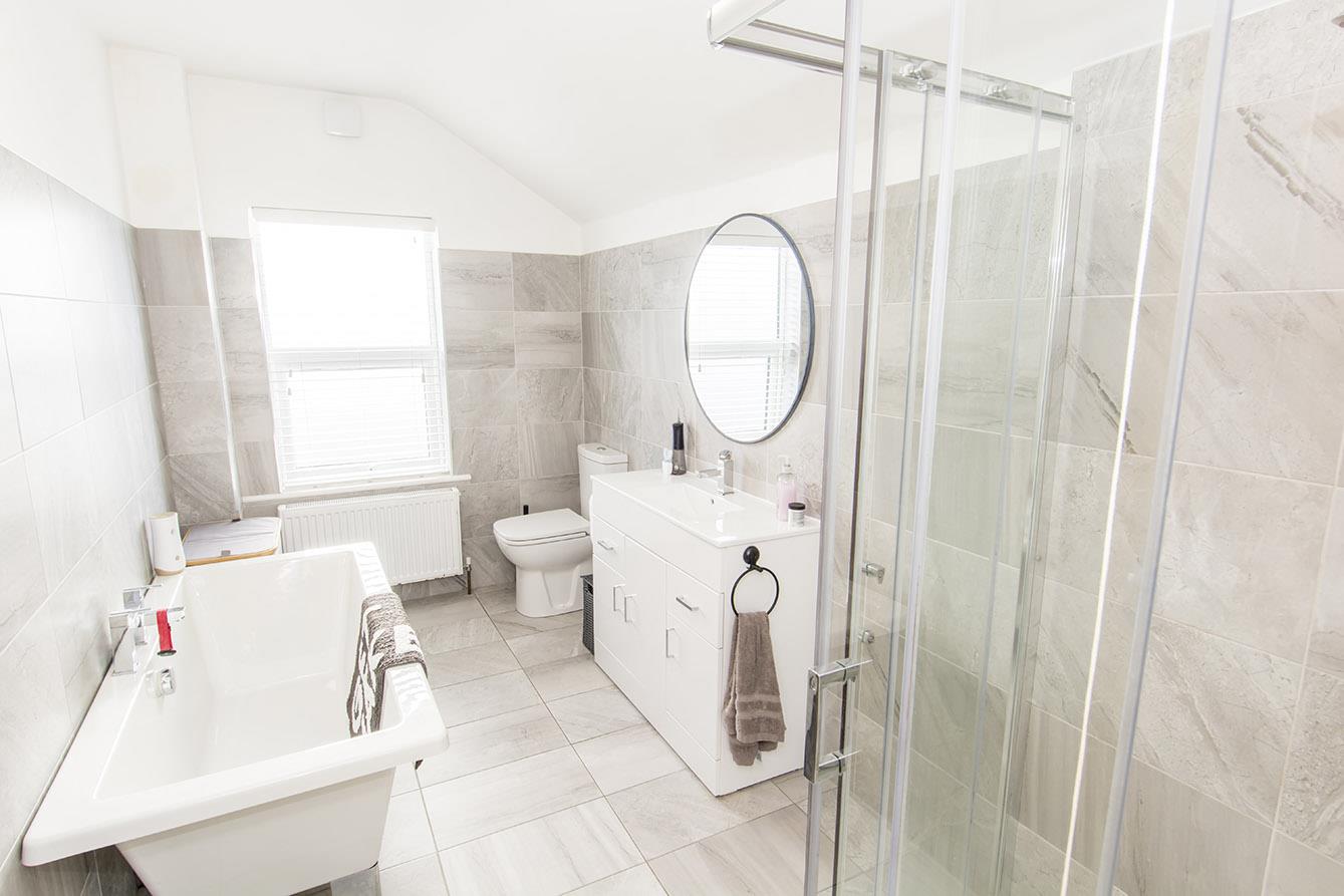 Bathroom - 12' 1" x 6' 3" (3.68m x 1.91m) Brand new white suite comprising: Tiled shower cubicle with mains shower fitment, panelled freestanding bath, vanity unit with inset wash hand basin, and low level WC. Complementary tiling. Radiator. Opaque double glazed window.