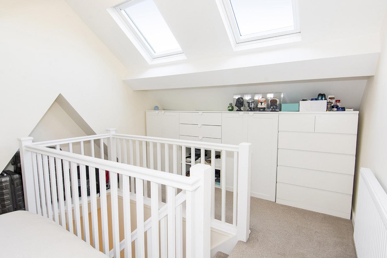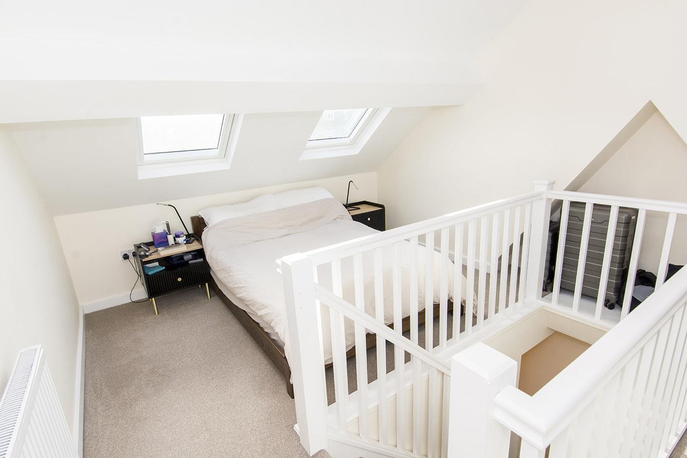 Bedroom Three - 5.23 x 3.28 (17'1" x 10'9") - with central stairwell. Pitched ceiling loft conversion with four double glazed windows and central galleried stairwell. Radiator.