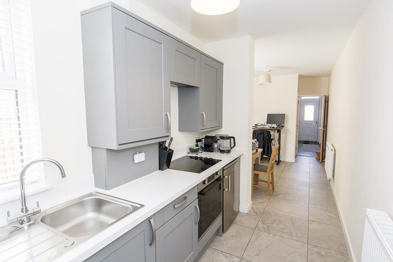 Kitchen - 3.68 x 1.91 (12'0" x 6'3") - Brand new modern fitted kitchen with a range of base and wall units and roll edge work surfaces. Fitted appliances to include: Automatic dishwasher, oven and four ring electric hob, and refrigerator. Stainless steel sink and drainer. Radiator. Wall mounted gas fired combination central heating boiler. Tiled flooring. Double glazed window to the side elevation.