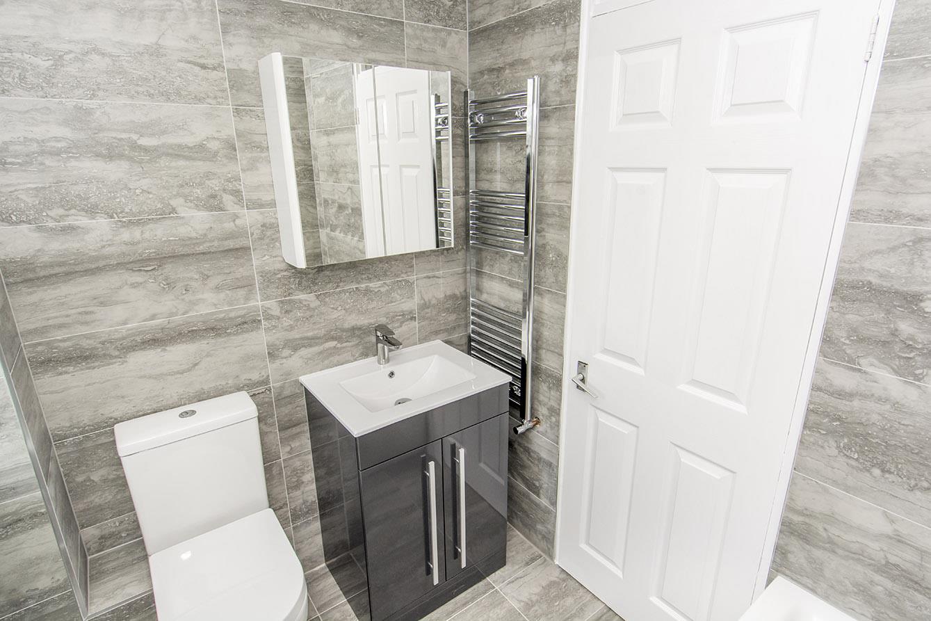 Bathroom - 1.98m x 1.73m (6'6" x 5'8") - Opaque UPVC double-glazed window to rear. Re-fitted white suite comprising WC, wash hand basin over storage unit and P-shaped shower bath with shower over and glazed shower screen. Extractor fan. Tiled walls. Tiled flooring.