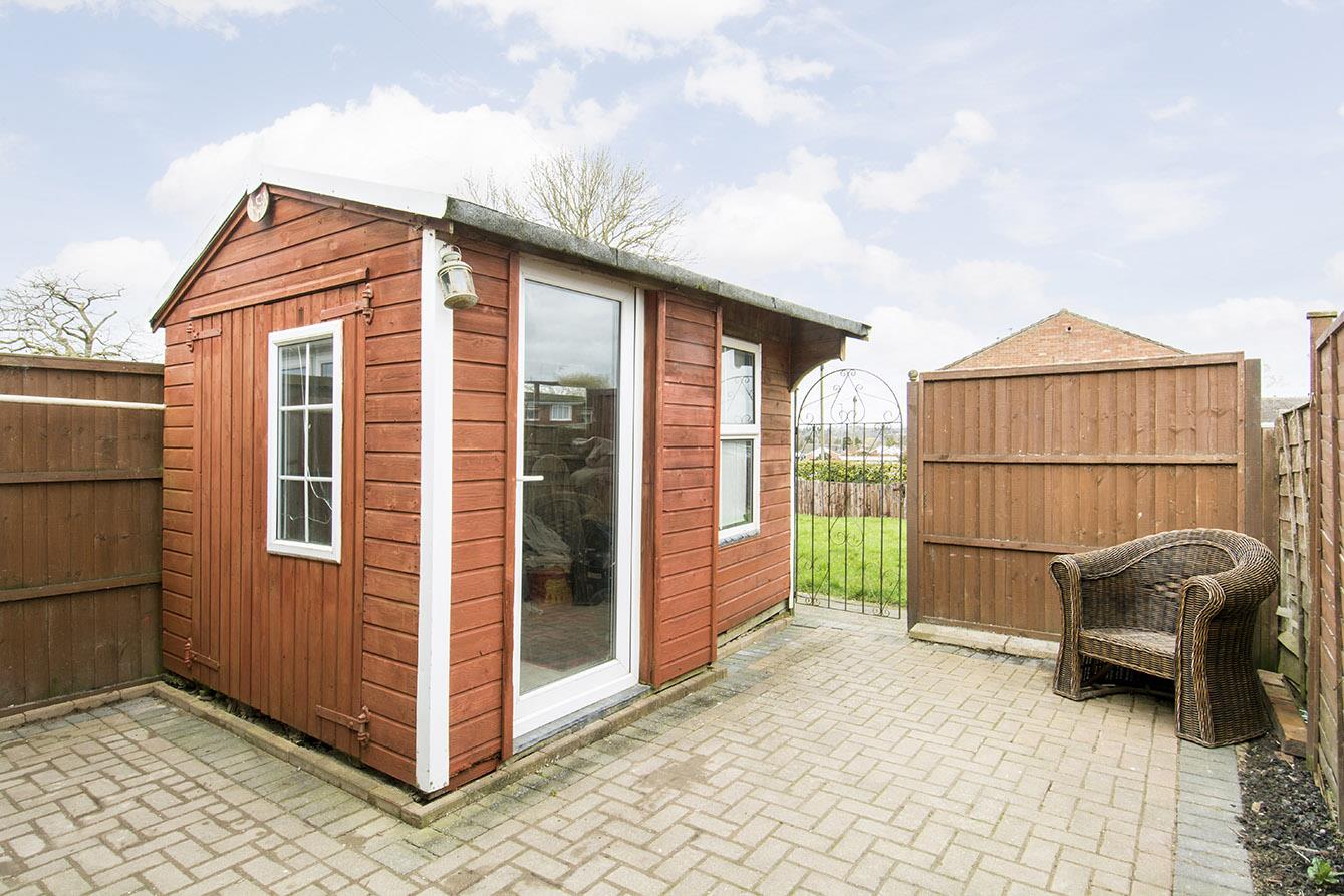 Rear Garden - Courtyard style mainly laid to block paving. Timber shed/summerhouse. Gated rear access leading out to a pleasant lawned communal green beyond and the block of garages beyond that.