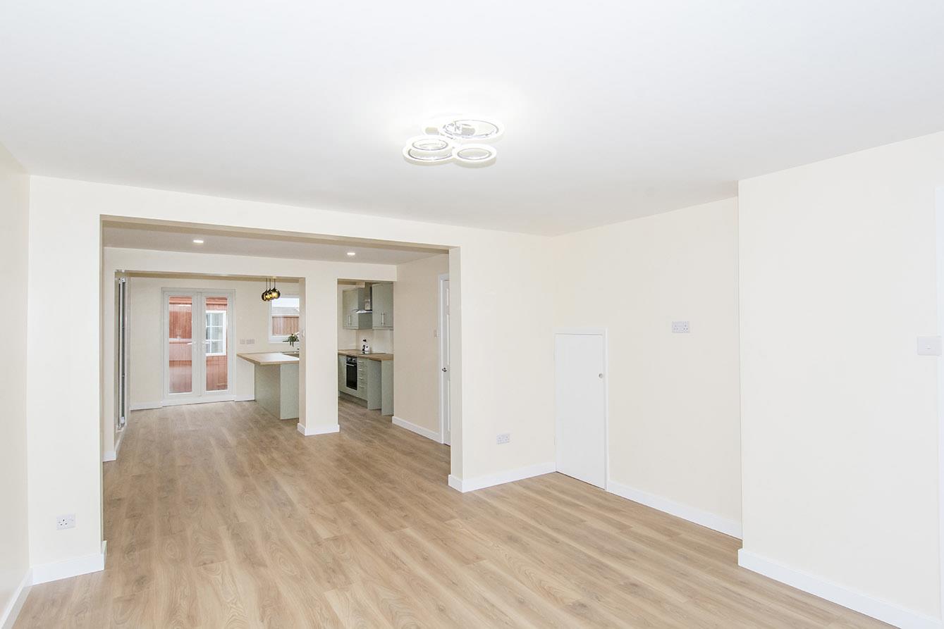 Lounge - 4.17m x 3.86m (13'8" x 12'8") - UPVC double-glazed window to front. Understairs storage cupboard. Laminate flooring. Radiator. Opening through to extended living/dining/kitchen.