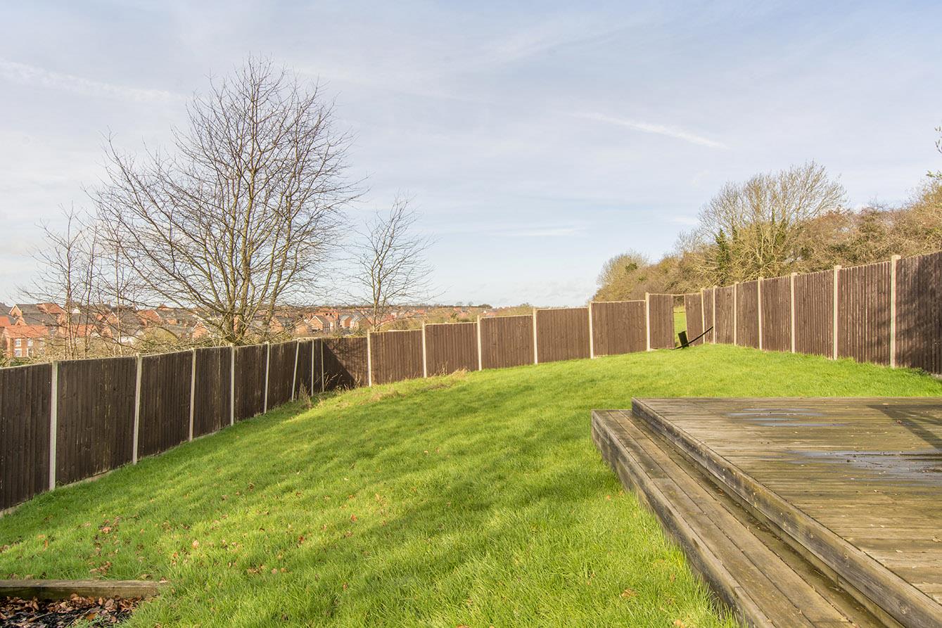 Rear Garden - The rear garden extends approximately 120' in length, is enclosed by timber lap fencing, and adjoins open paddock land to the rear. It is laid mainly to lawn with a paved patio area and further raised and decked seating area. There are also raised beds and steps down to the rear of the garage.