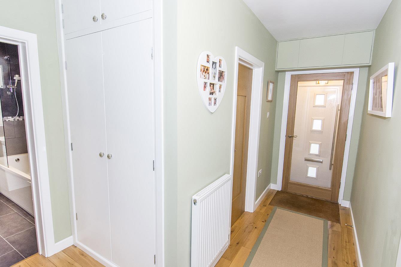 Entrance Hallway - Exposed oak flooring. Radiator. Thermostat. Airing cupboard housing gas fired combination central heating boiler. Solid oak doors to rooms.