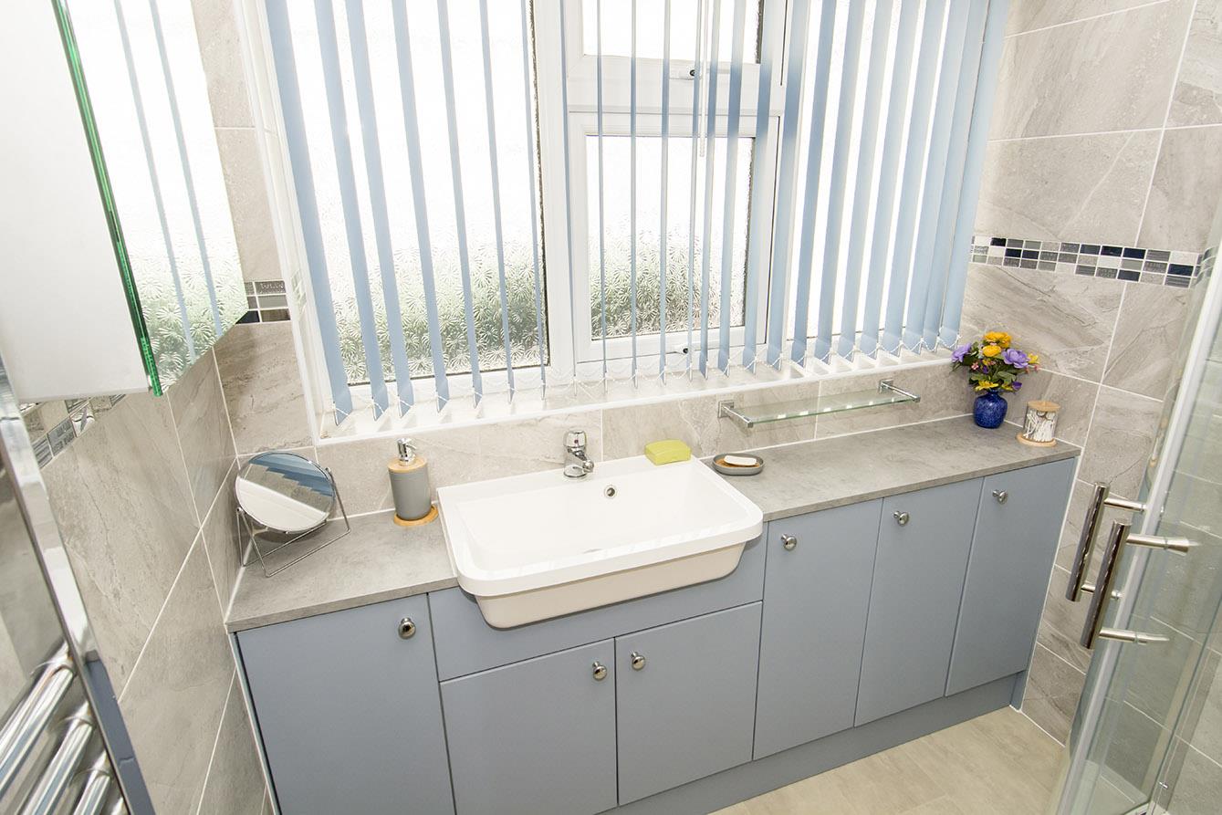 Shower Room - Opaque UPVC double-glazed window to rear. Wash hand basin over storage unit. Shower cubicle. Tiled walls. Shaver point. Heated towel rail.