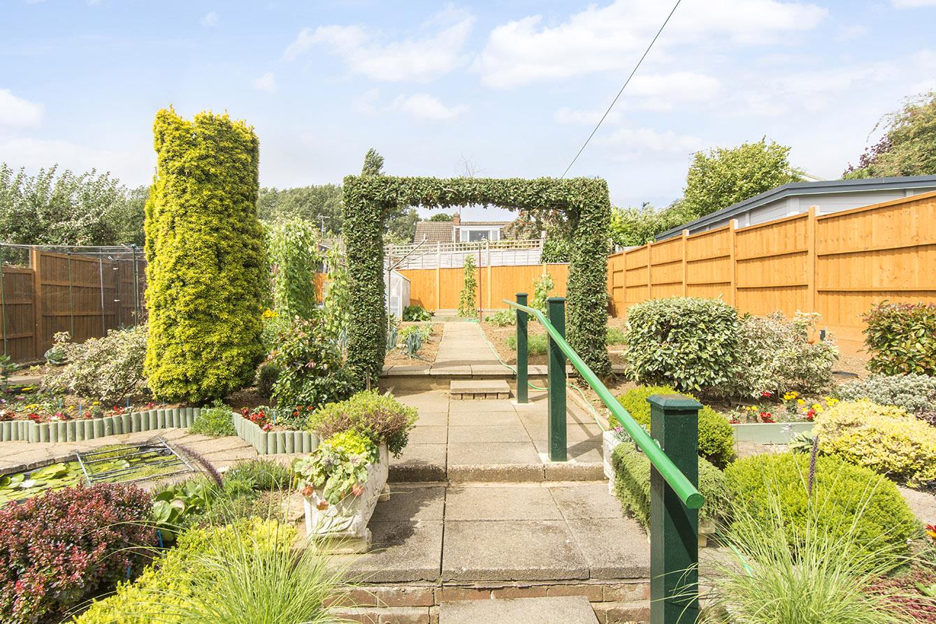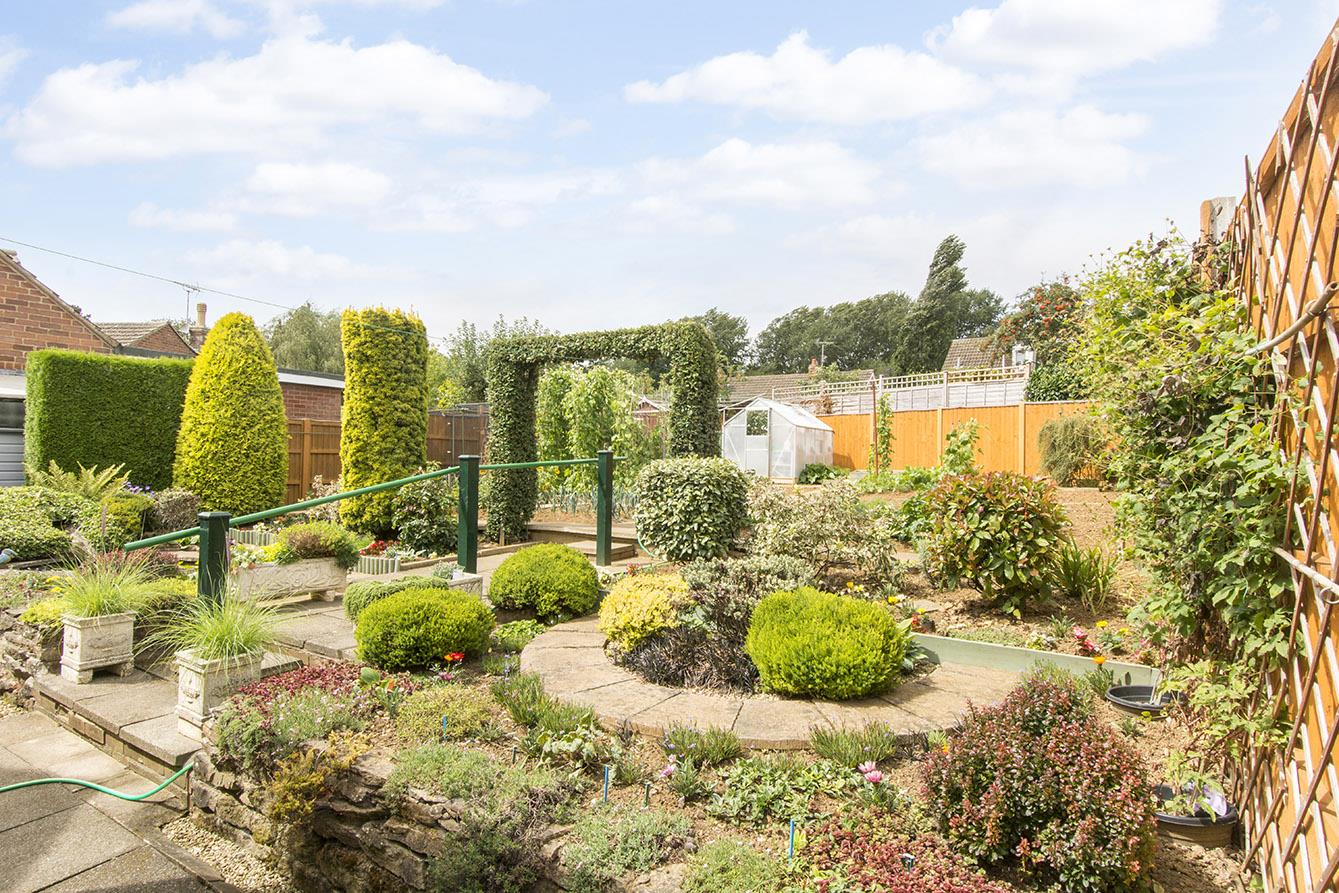 Rear Garden - A variety of paved patio and pathways. Attractive pond. Variety of plant and vegetable beds. Greenhouse. Timber shed. Enclosed by timber fencing.