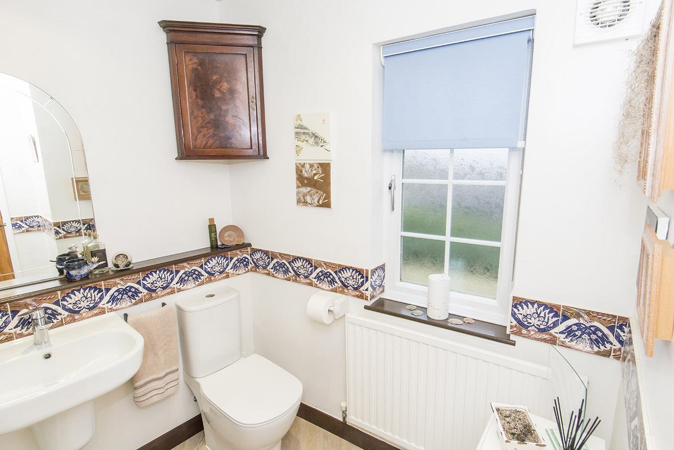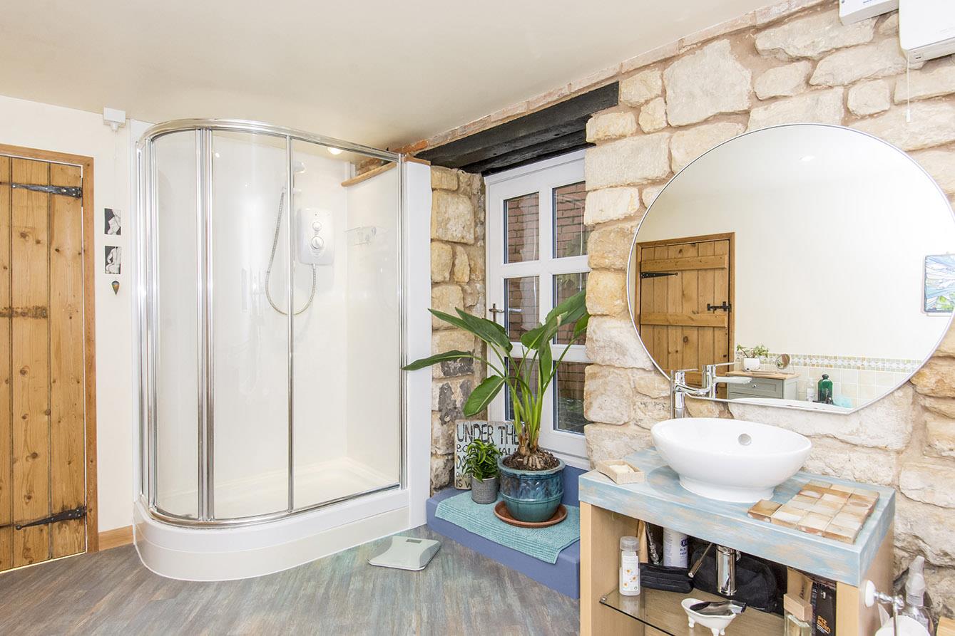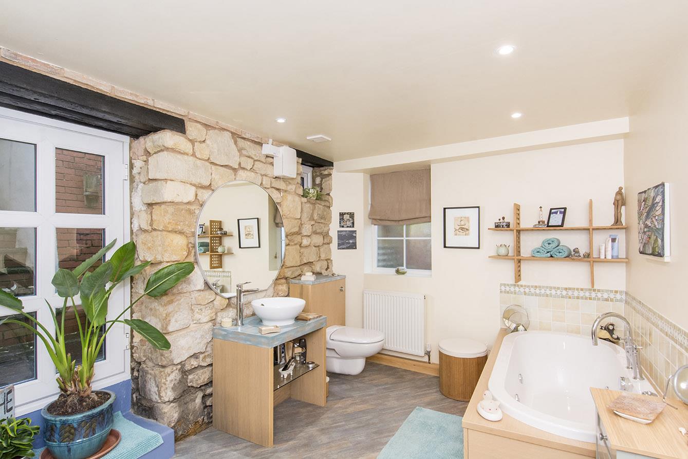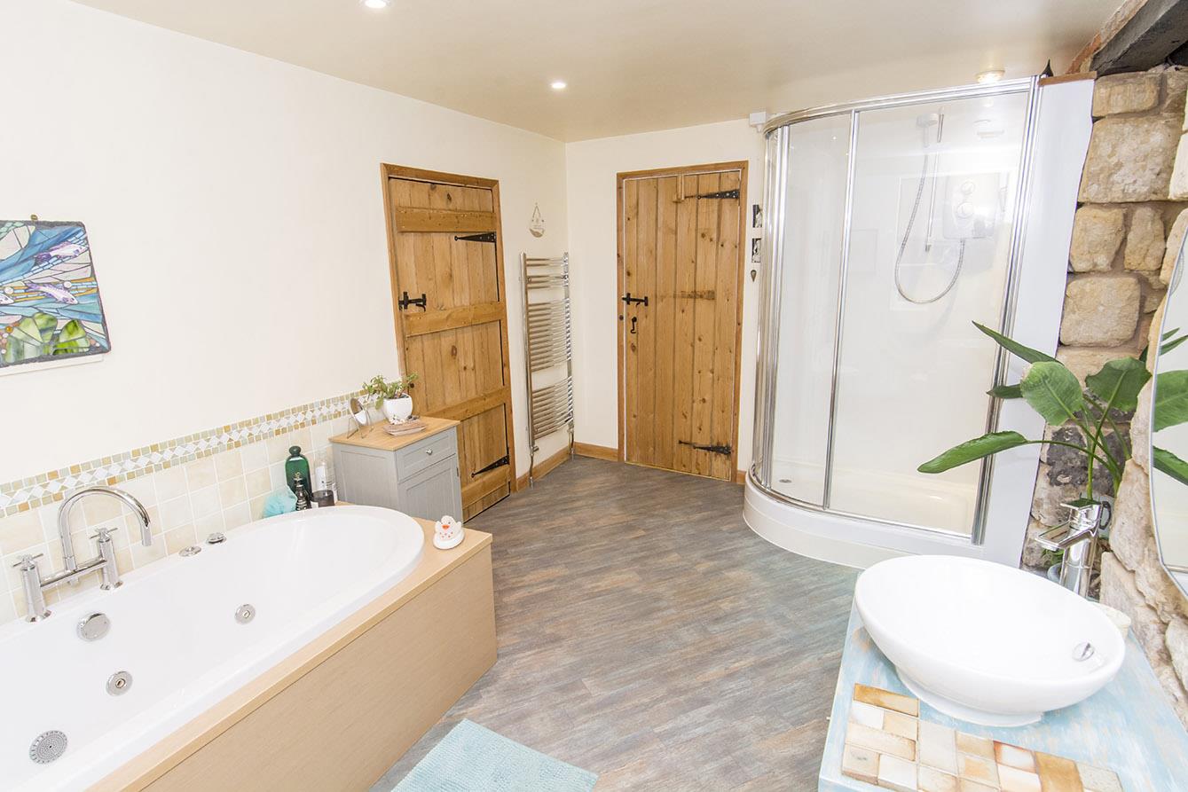 Master En-Suite Bathroom - 3.96m approx x 2.59m (13'0" approx x 8'6") - UPVC double-glazed windows to rear and side aspects. UPVC double-glazed rear entrance door leading out to the rear garden. Exposed stone wall. WC. Wash hand basin. Spa bath. Shower cubicle. Extractor fan. Karndean flooring. Heated towel rail.