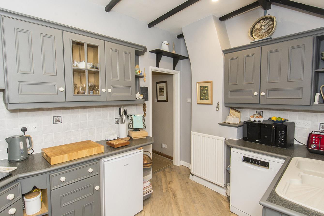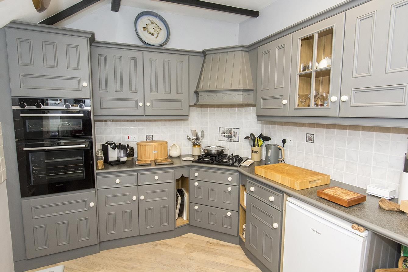 Kitchen - 3.58m x 2.59m approx (11'9" x 8'6" approx ) - UPVC double-glazed window to rear. Composite double-glazed stable door. Fitted range of wall and floor mounted units. Electric double oven. Gas hob with extractor hood. Space and plumbing for dishwasher. Space for fridge. Tiled walls. Karndean flooring. Spotlights to ceiling. Radiator.