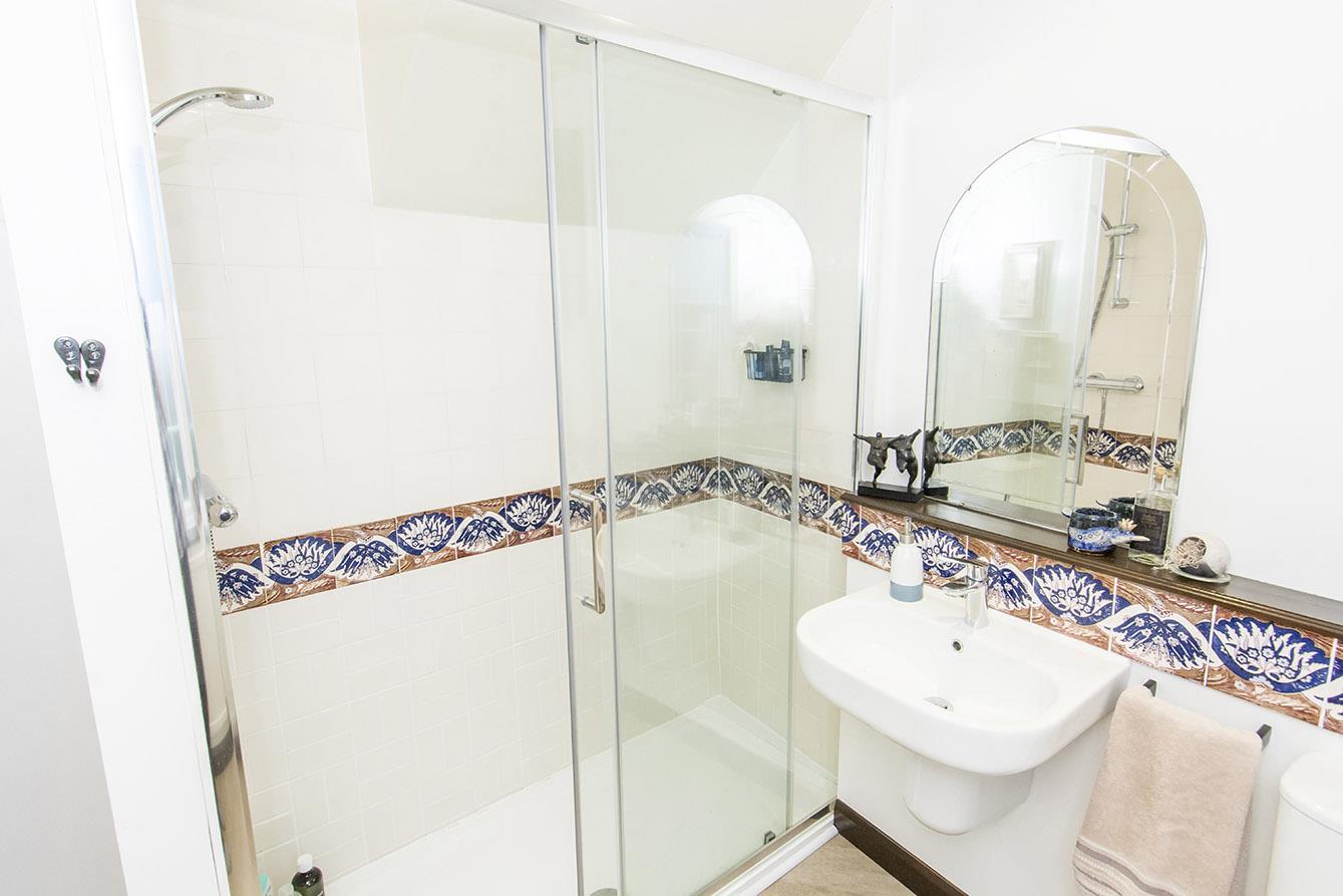 Shower Room - Opaque UPVC double-glazed window to front. WC. Wash hand basin. Shower cubicle. Italian tiling to walls. Karndean flooring. Radiator.