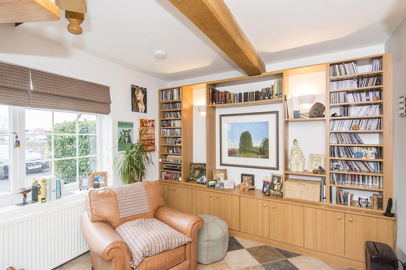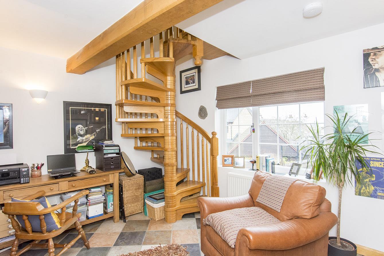 Study - 4.19m approx x 3.12m (13'9" approx x 10'3") - UPVC double-glazed window to front. Built in media unit. Radiator. Tiled flooring. Spiraled bespoke staircase leading up to lounge.
