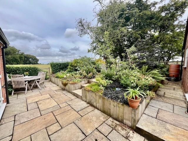 Front - Block paved driveway providing off road parking for numerous vehicles. Lawned front garden siding onto open countryside. Plant boarders. Double metal gates leading under car port into the rear garden.