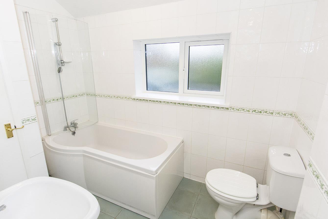 Bathroom - 2.74m x 1.83m (9'00" x 6'00") - Fitted with a low level WC . Pedestal wash hand basin. Bath with shower and side screen. Ceramic wall tiles. Opaque window to the rear aspect. Airing cupboard housing the hot water cylinder.