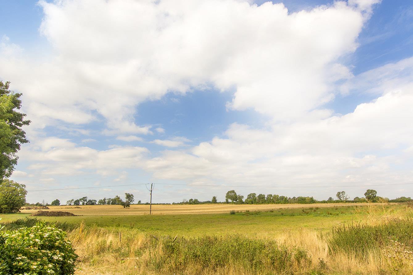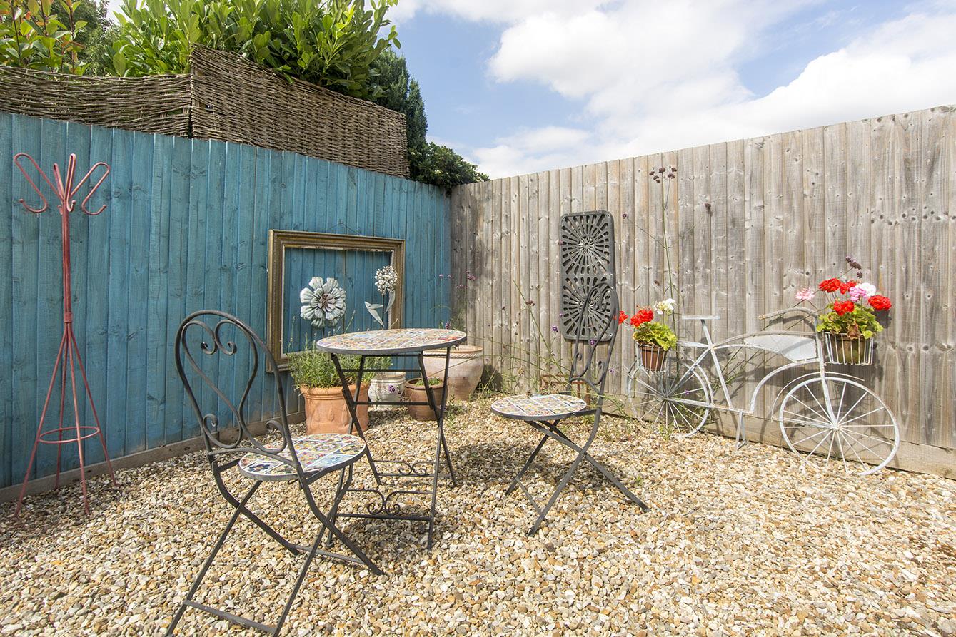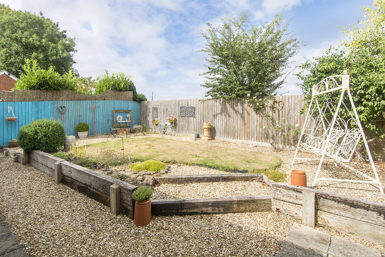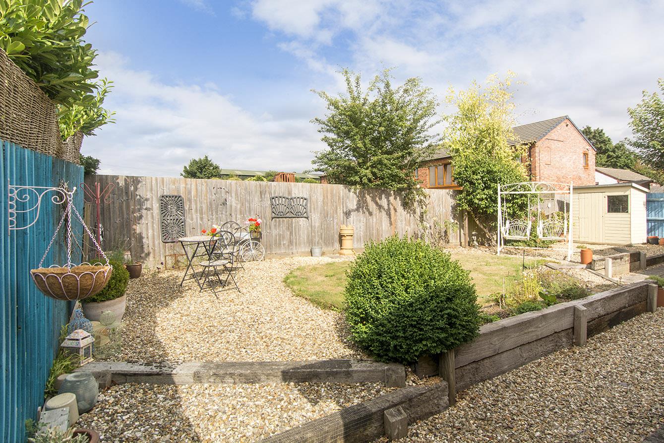 Garden - This private garden has wonderful field views, there is a paved patio area with steps framed by railway sleepers leading to the lawn. There are planted borders ,a garden shed and the oil tank situated at the side.