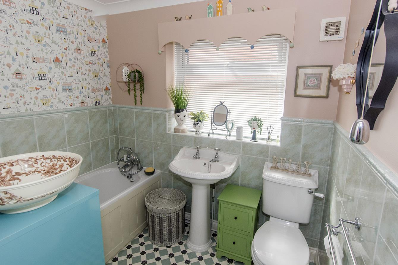Bathroom - 2.31m x 1.68m (7'7" x 5'6") - Fitted with a high quality suite comprising, low flush WC, hand wash basin, bath with shower attachment taps, half height ceramic wall tiles and an obscure glazed window.