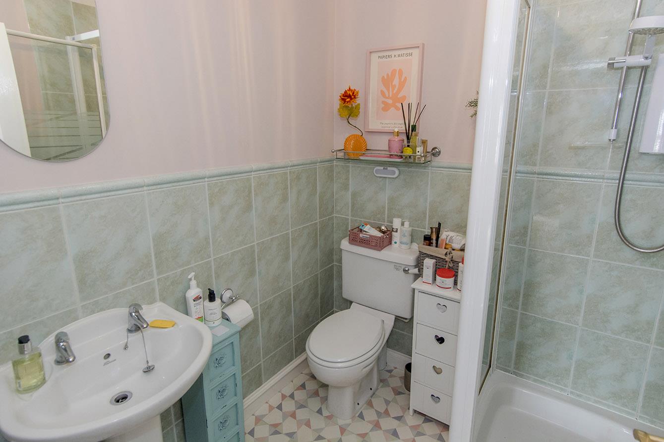 En-Suite - 1.73m x 1.85m (5'8" x 6'1") - Fitted with a low flush WC, wash hand basin and a corner shower cubicle with ceramic wall tiling.
