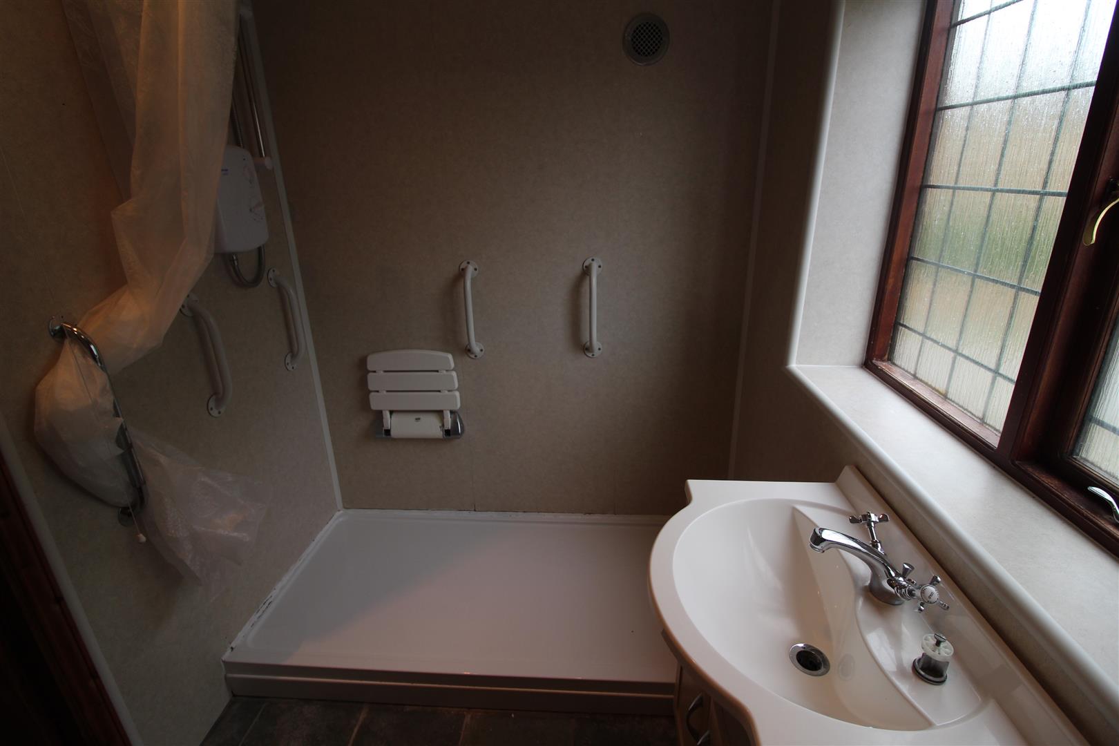 Shower Room - Walk in double shower cubicle with electric shower fitment. Wash hand basin. Low level WC. Slate tiled flooring. Heated towel rail. Opaque double glazed window.