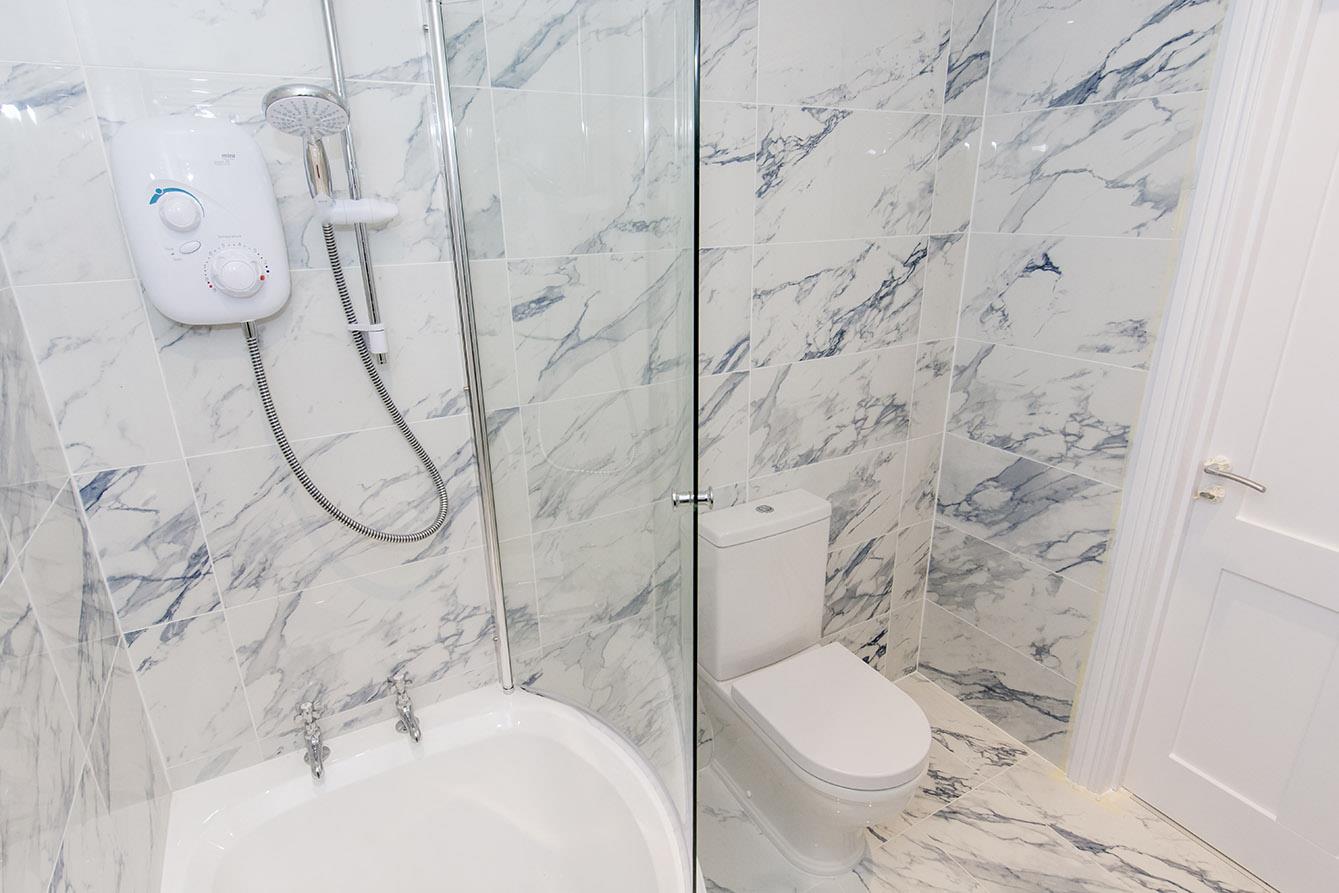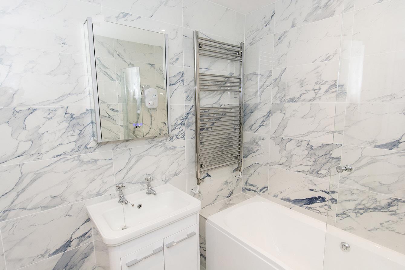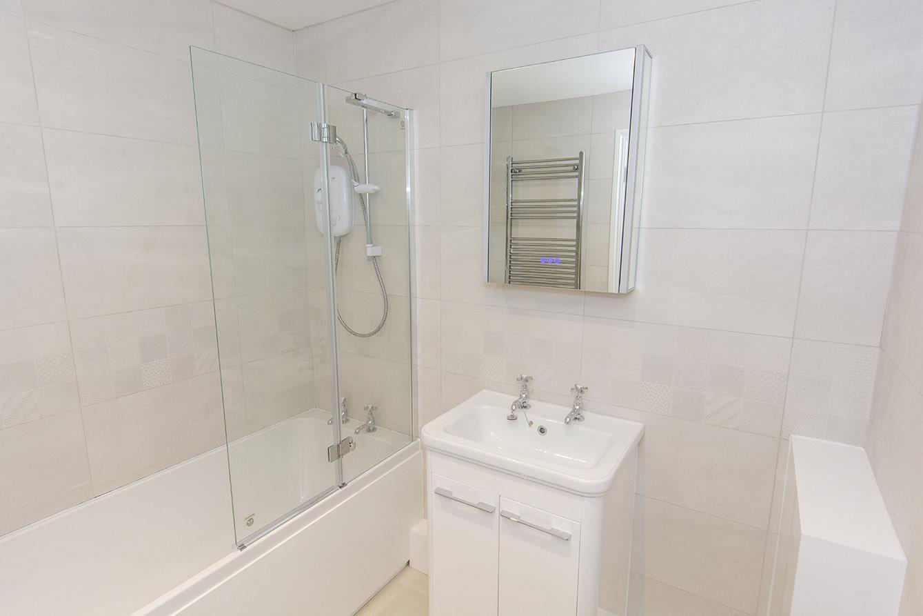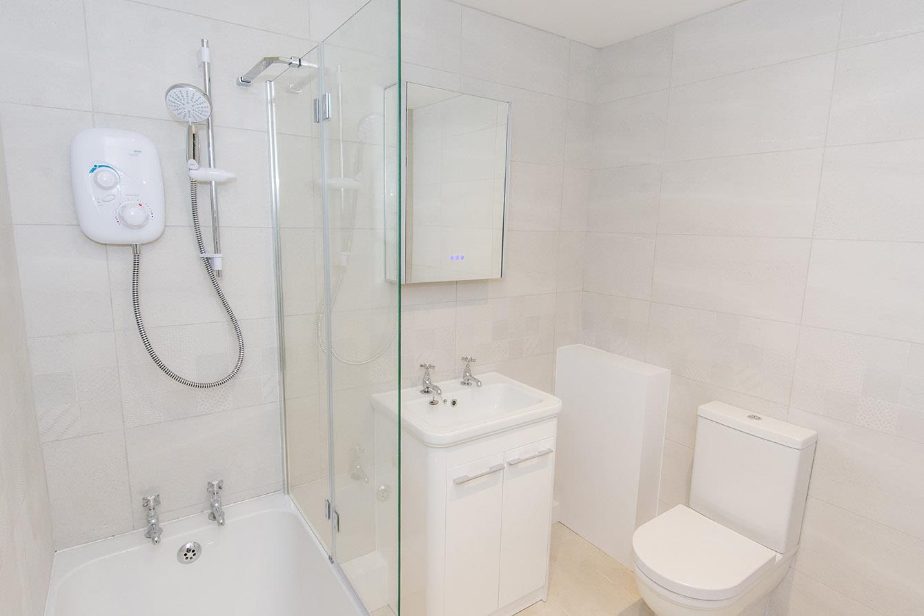 Bathroom - Panelled bath with electric shower fitment over. Wash hand basin. Low level wc. Complimentary tiled walls and flooring. Heated towel rail. Extractor fan. Mirrored vanity unit with lights, anti-steam heating and speakers which link to Bluetooth. This also includes a shaver point inside.