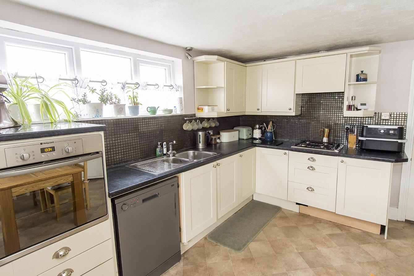 Kitchen Area - 4.34m x 3.45m (14'3" x 11'4") - Fitted base and wall units. Laminated work surfaces with complementary tiled splash backs. Fitted oven and four ring gas hob with extractor fan over. Space and plumbing for automatic dishwasher. Double glazed window to the side elevation. Opening through to:-